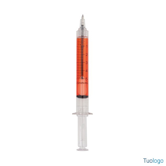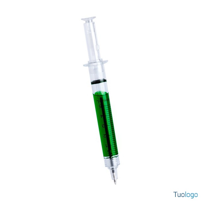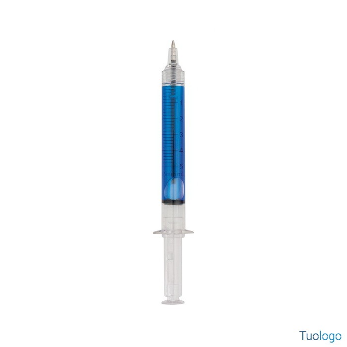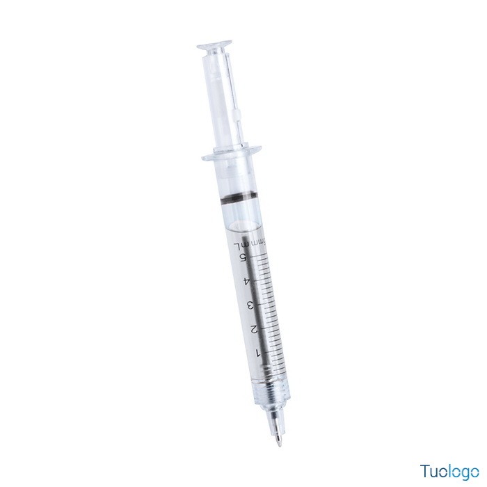 Penna siringa Meda. Penna a sfera in plastica a forma di siringa con corpo trasparente riempito di liquido e refill blu. diam. cm 1,1x12,7.