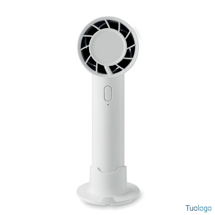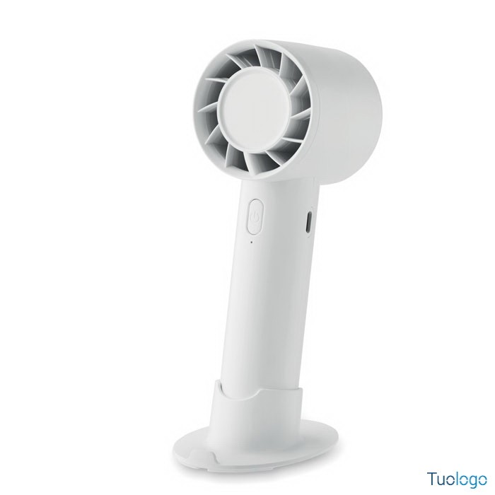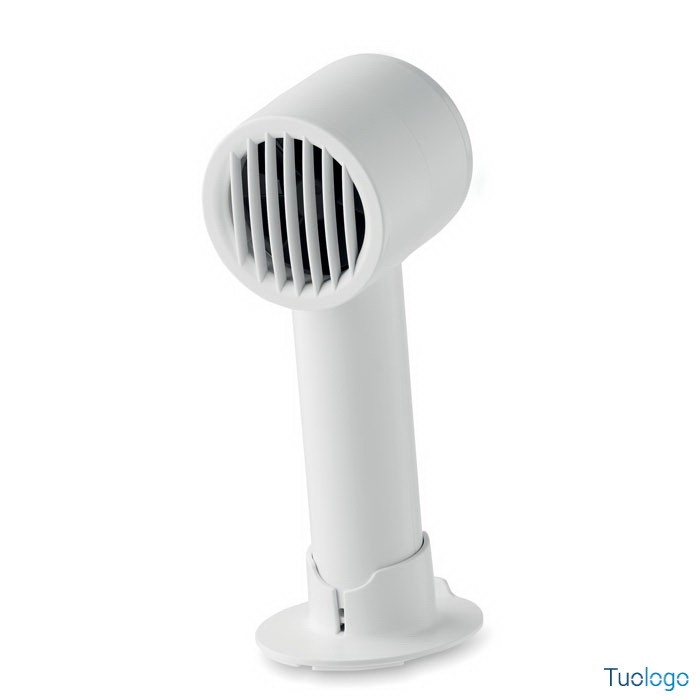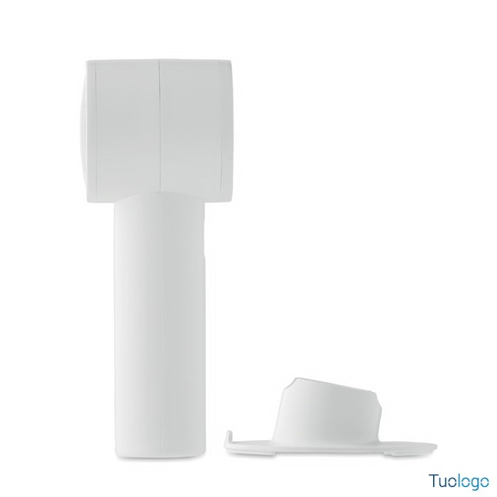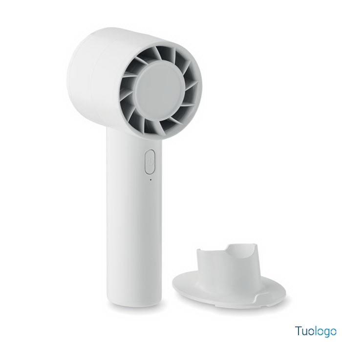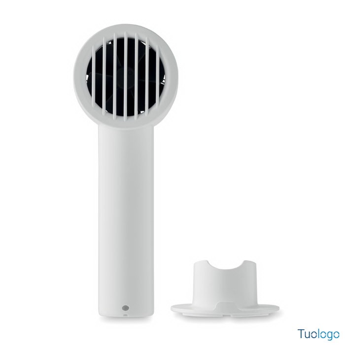 Piccolo ventilatore portatile Missi. Piccolo ventilatore portatile con supporto da tavolo aggiuntivo con opzione di supporto per telefono. 3 impostazioni di velocità. Batteria ricaricabile con porta USB da 20. Dimensioni: cm 8,6x6,3.