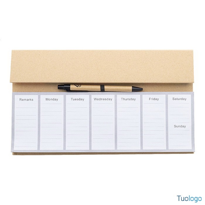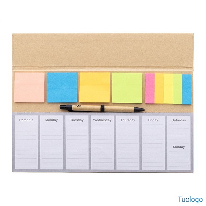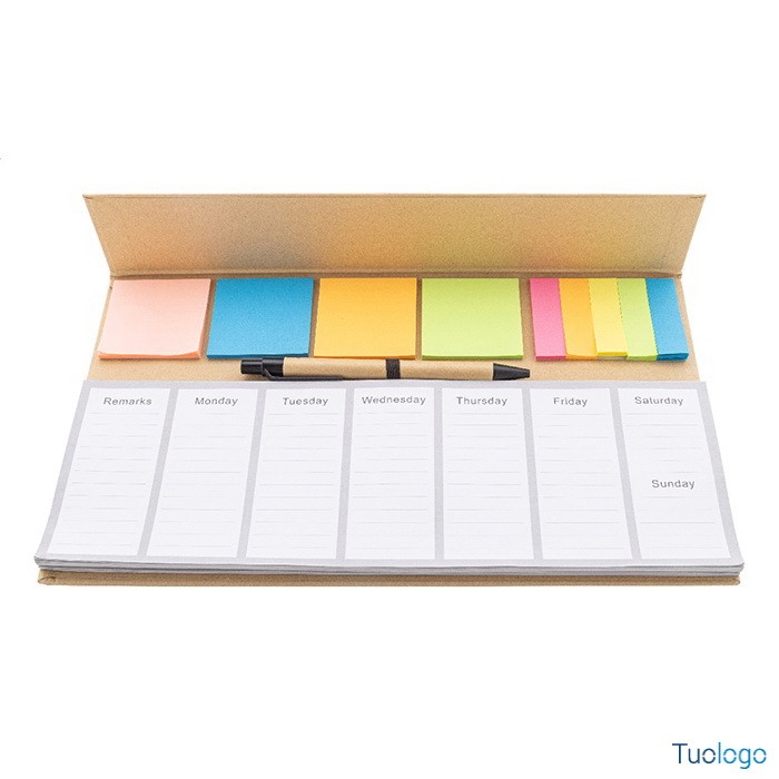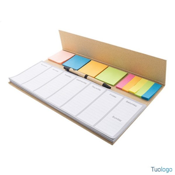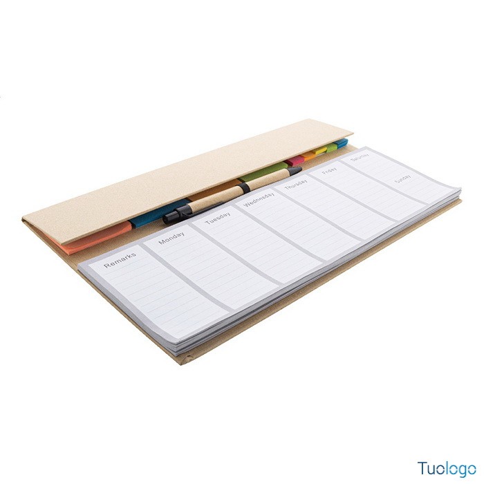 Planning Deerhi. Set da scrivania composto da planner settimanale da 50 fogli in carta riciclata non datati, 100 foglietti adesivi in 4 colori e 125 segnapagina. Dimensioni: cm 30,2x17,4x0,8.