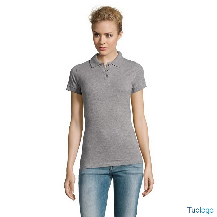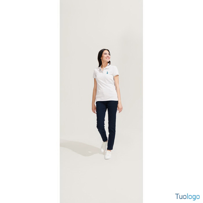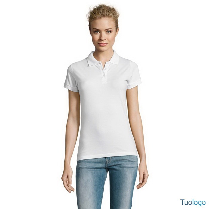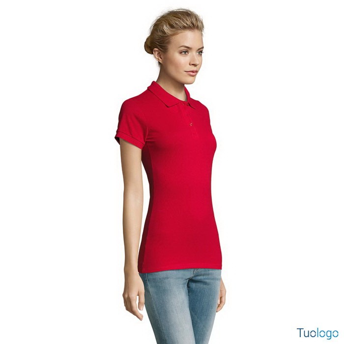 Polo donna Morelia. SOLS. 100% cotone pettinato Ringspun, 180 gr, collo e giromaniche a costina 1x1, nastro di rinforzo sul collo, maniche corte, 2 bottoni in tinta. Stampa ad 1 colore inclusa.