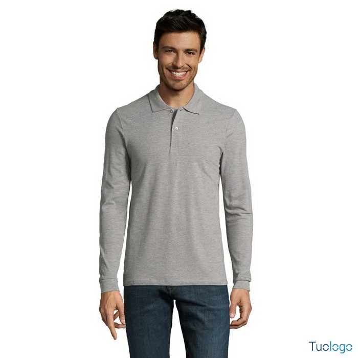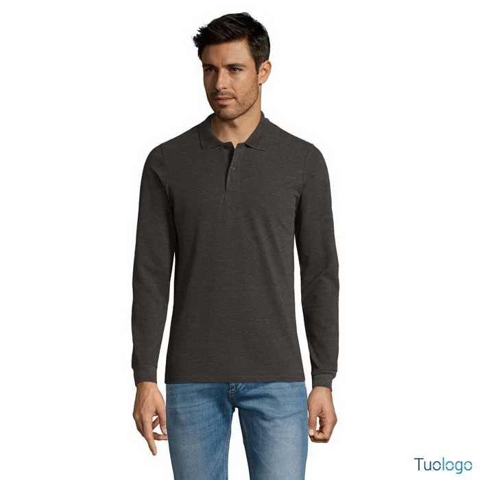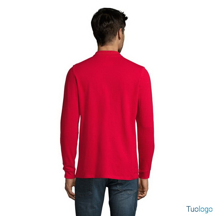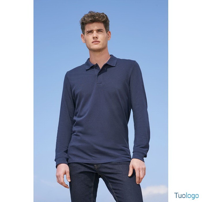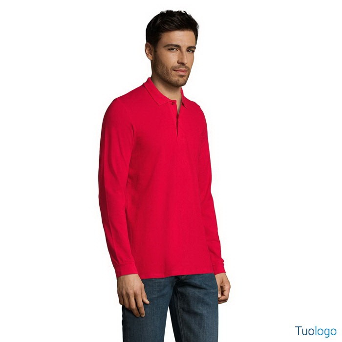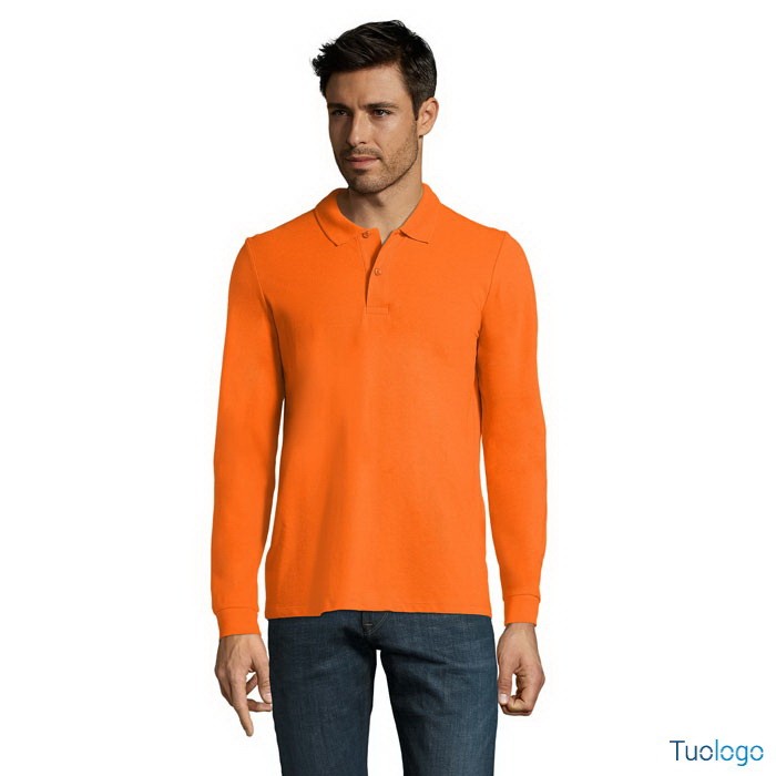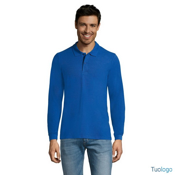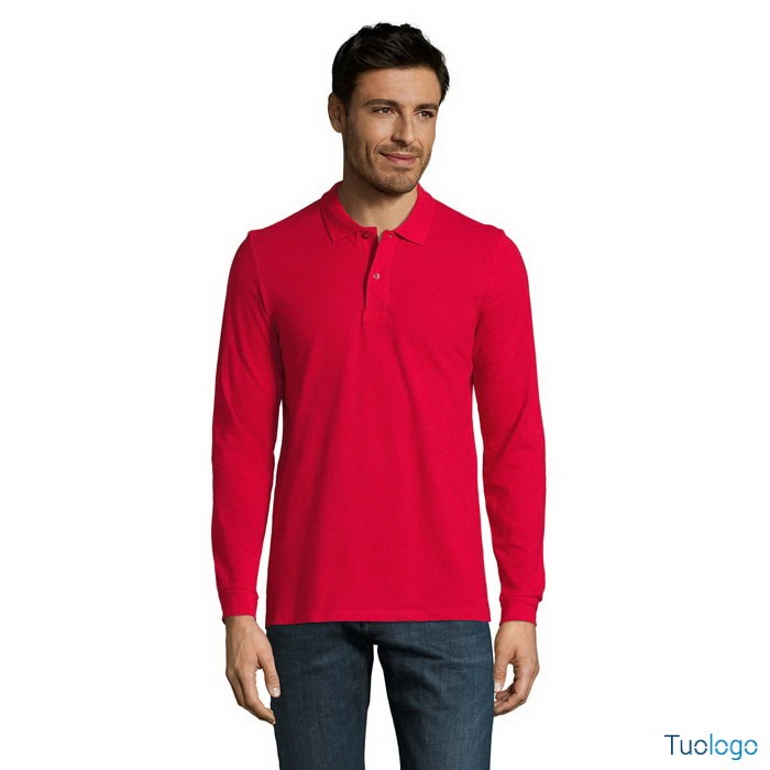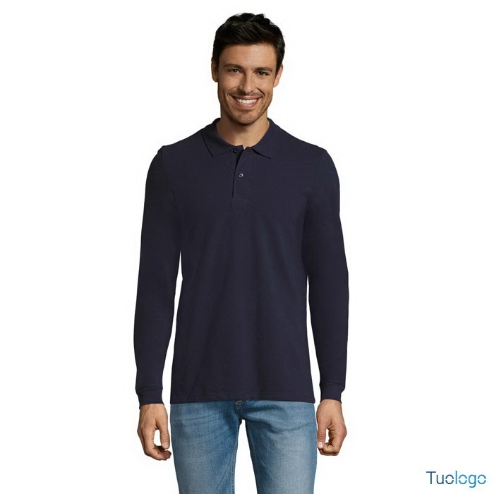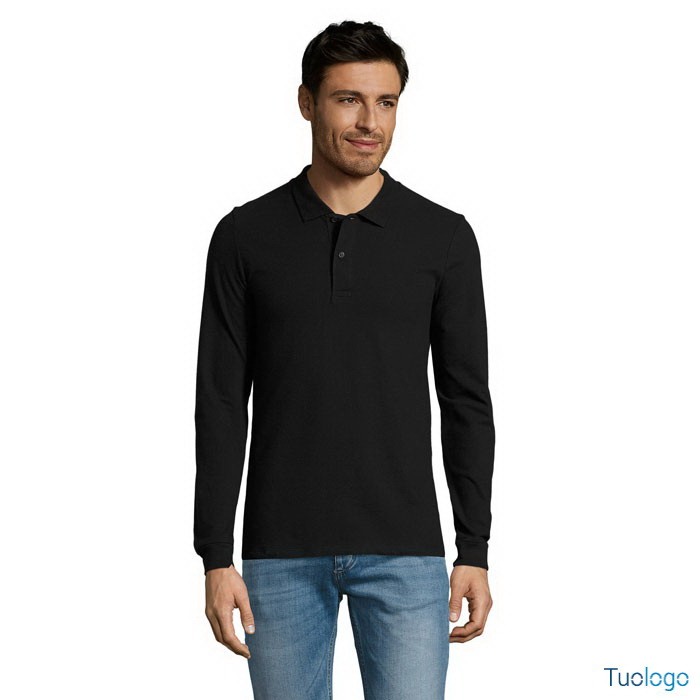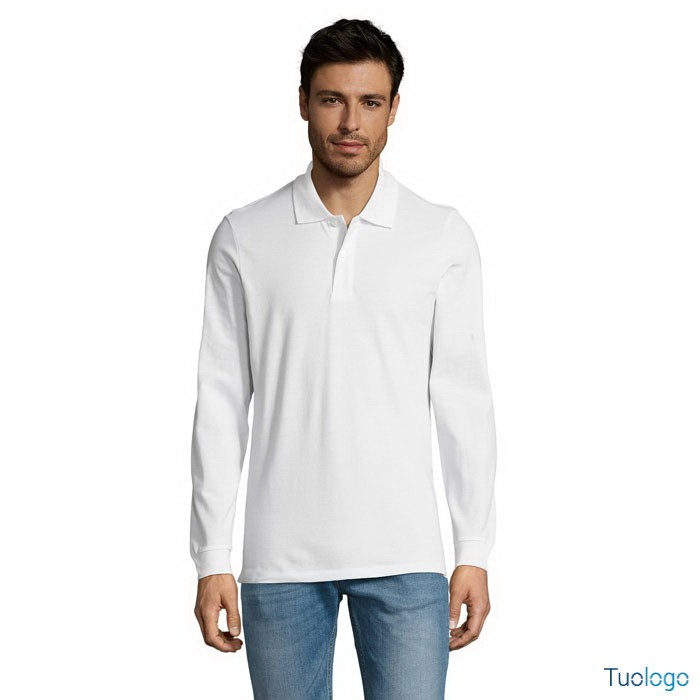 Polo uomo manica lunga Irapeo. SOLS. 100% cotone pettinato piqué 180, colletto e polsini a coste, nastro di rinforzo sul collo, maniche lunghe, 2 bottoni. Stampa ad 1 colore inclusa.