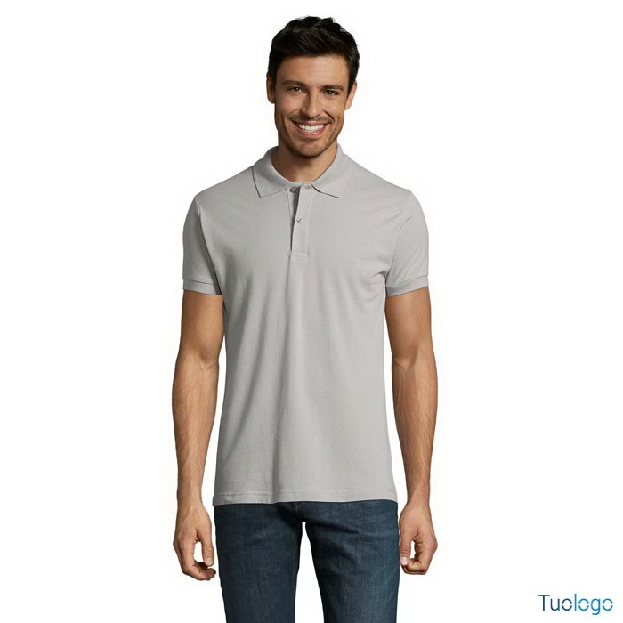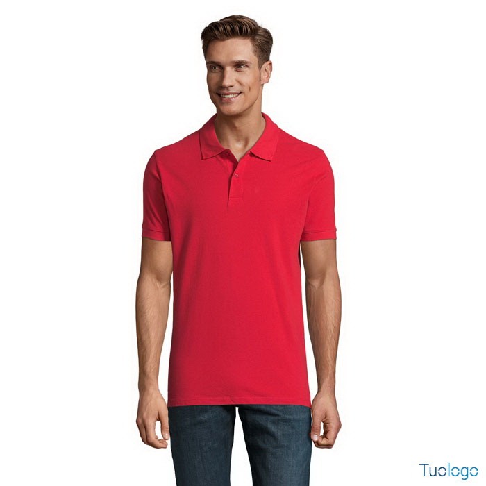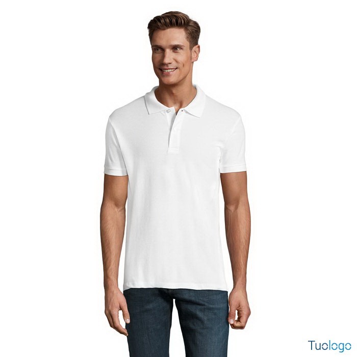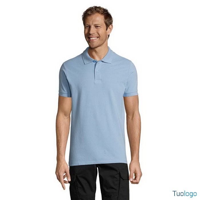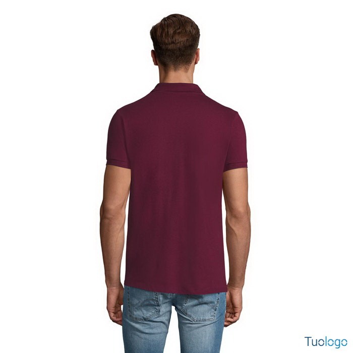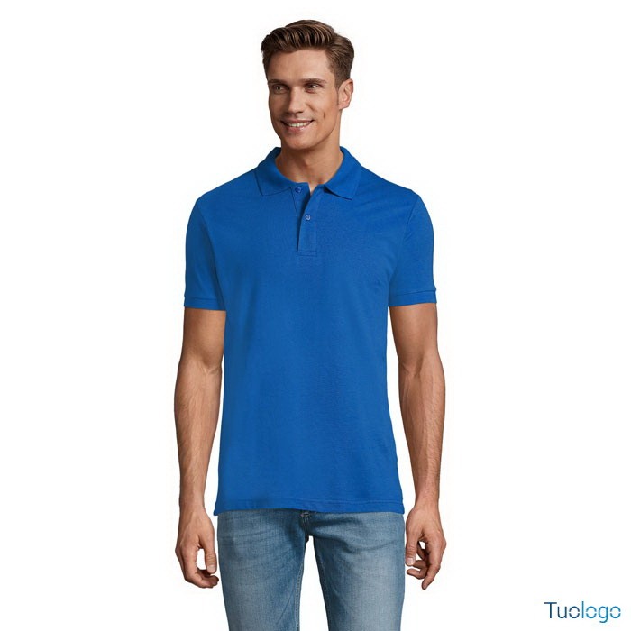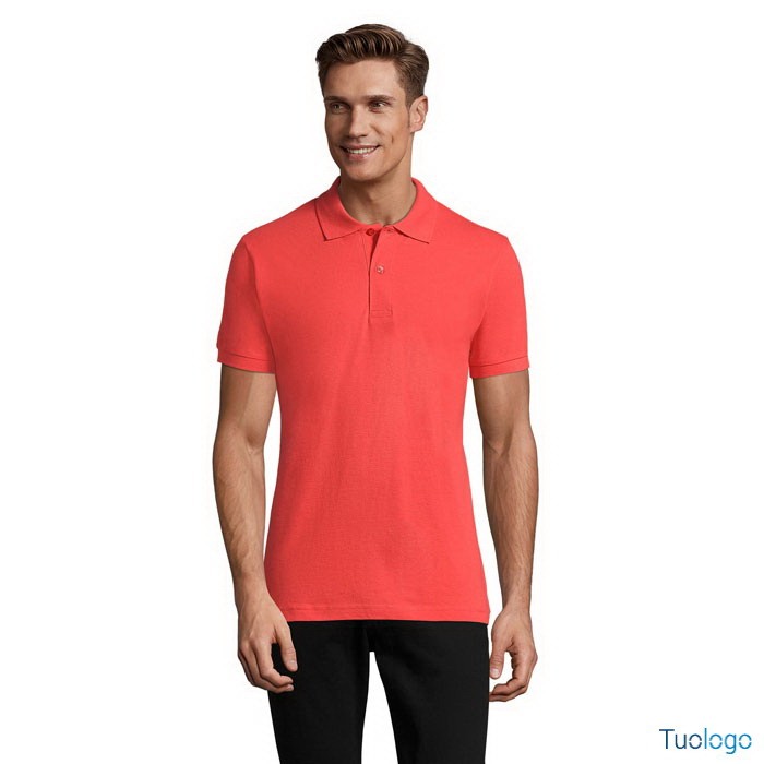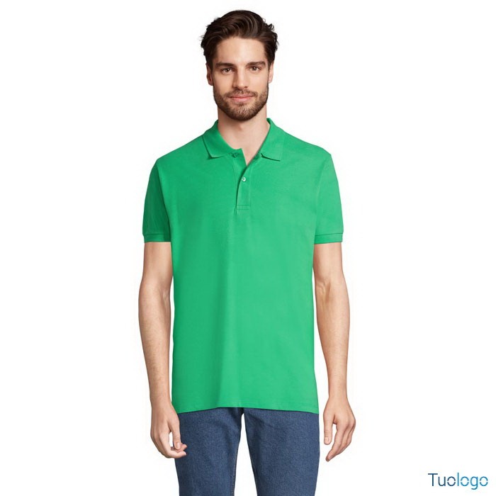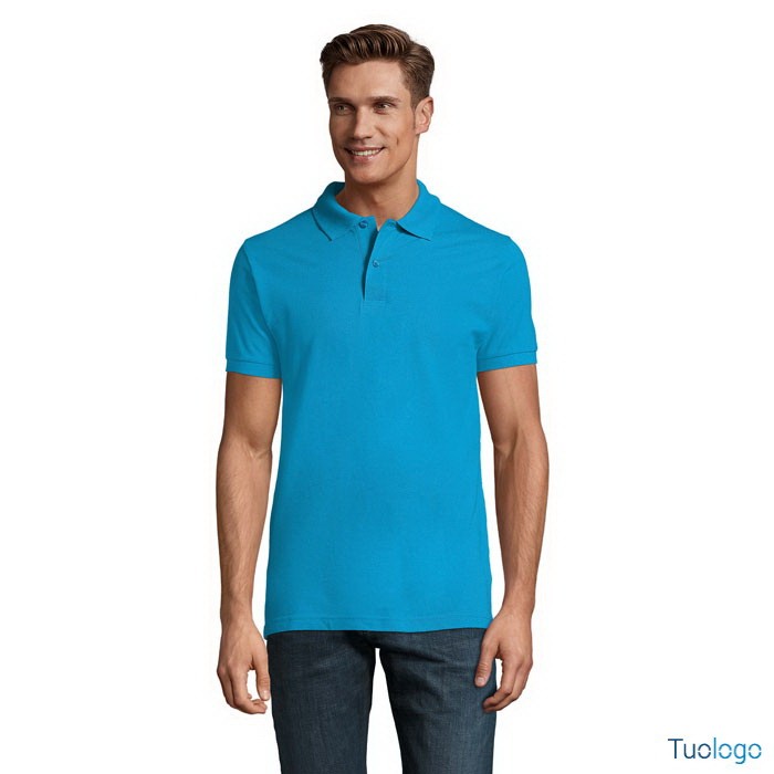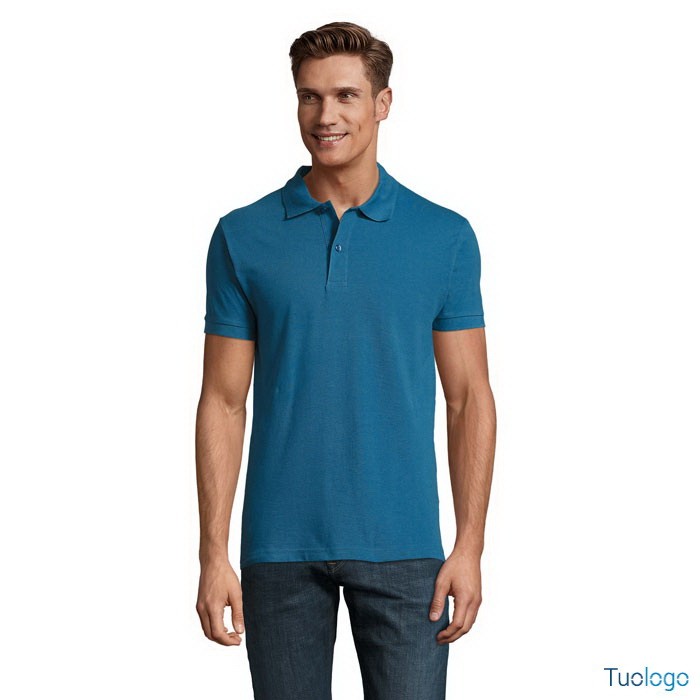 Polo uomo Morelia. SOLS. 100% cotone pettinato ringspun piqué 180, colletto e polsini a coste, nastro di rinforzo sul collo, maniche corte, 2 bottoni perlati tono su tono, tagliata e cucita. Stampa ad 1 colore inclusa.