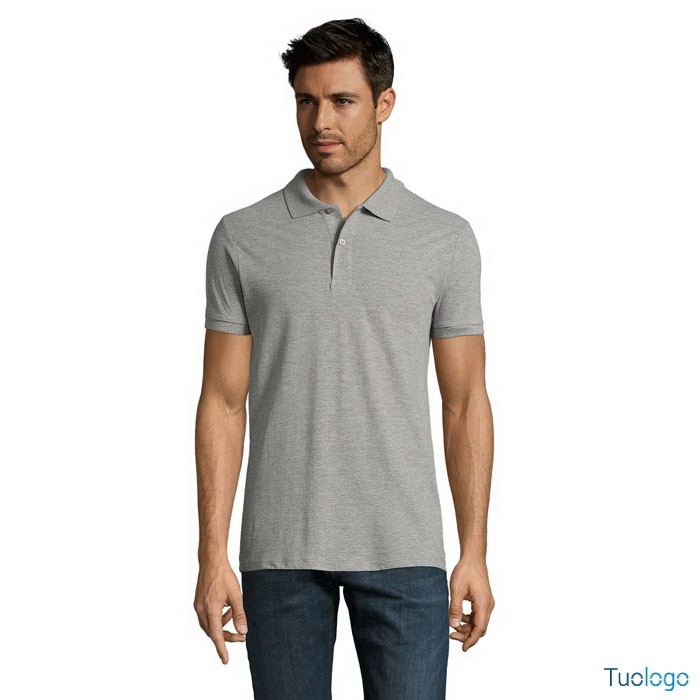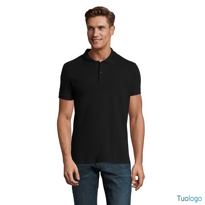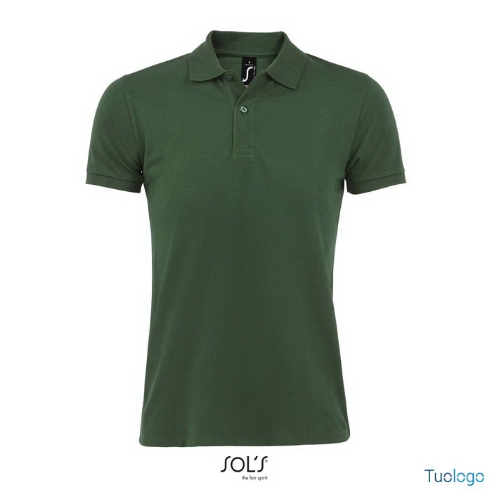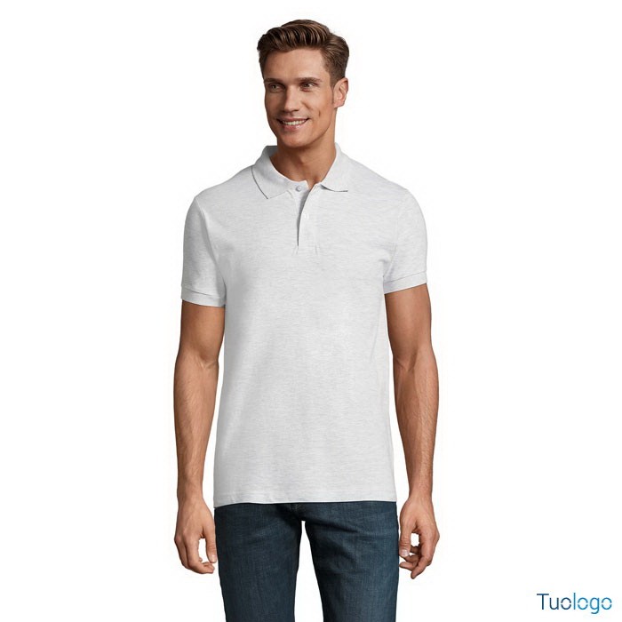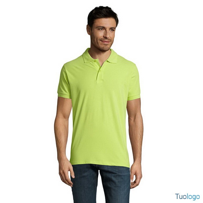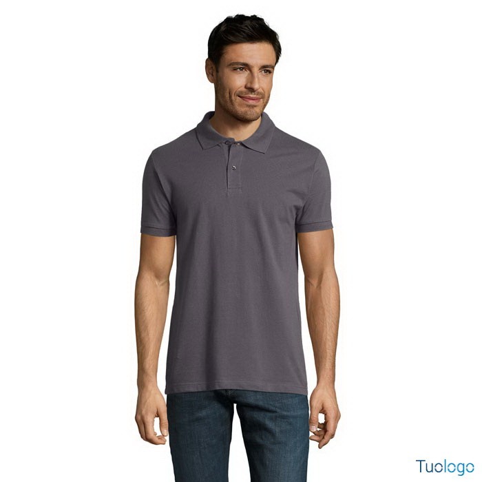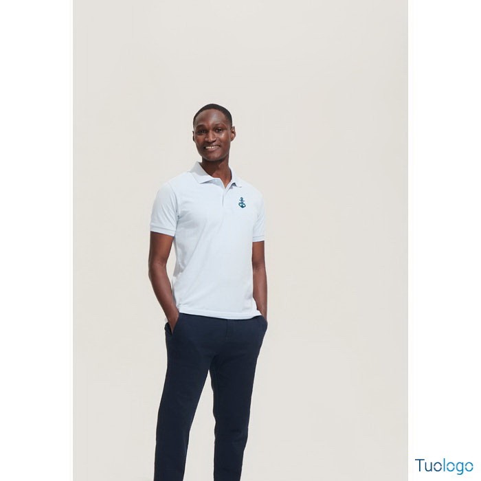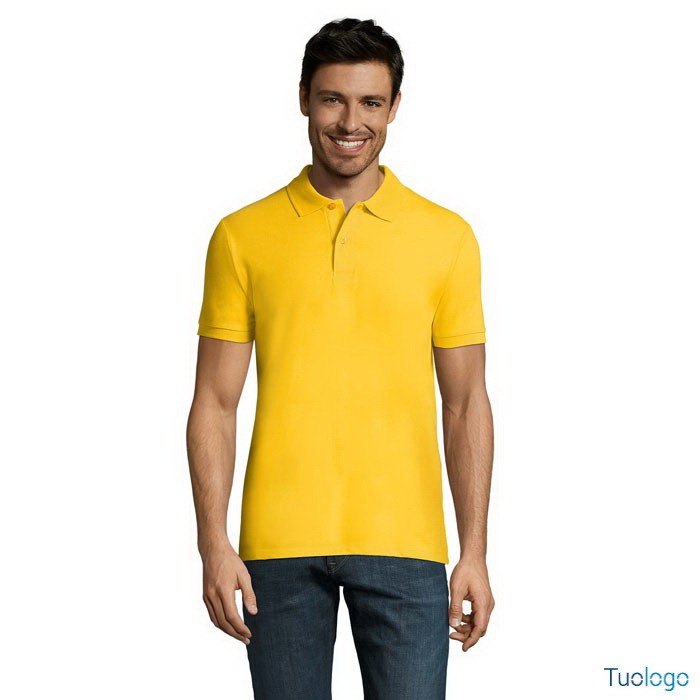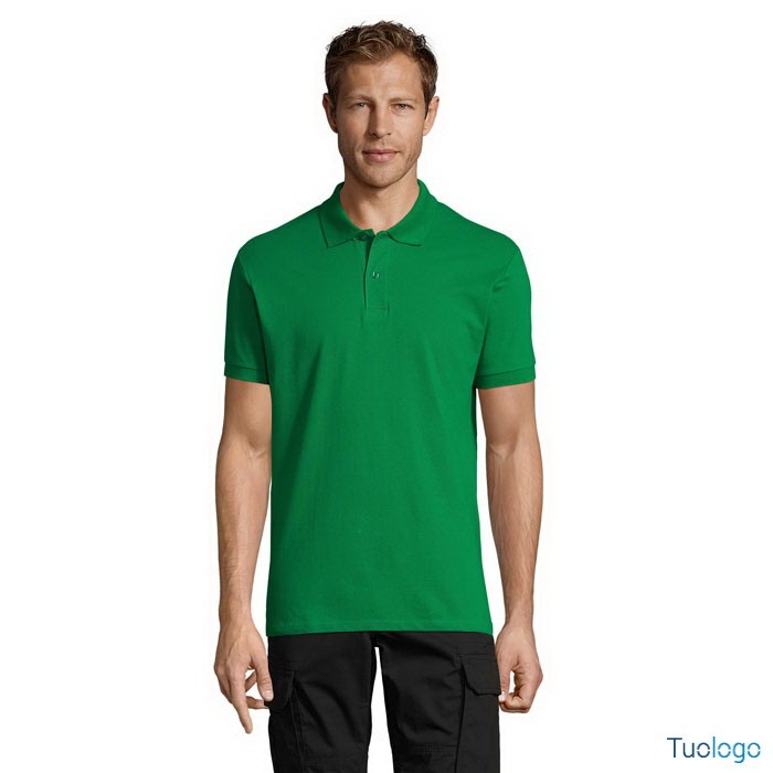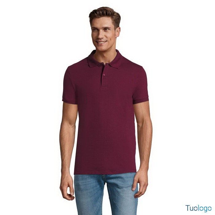 Polo uomo Morelia. SOLS. 100% cotone pettinato ringspun piqué 180, colletto e polsini a coste, nastro di rinforzo sul collo, maniche corte, 2 bottoni perlati tono su tono, tagliata e cucita. Stampa ad 1 colore inclusa.