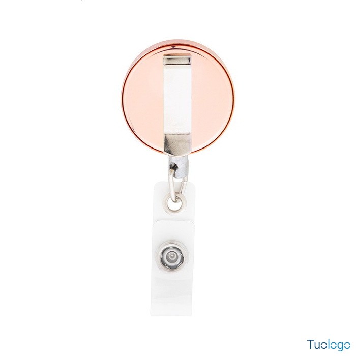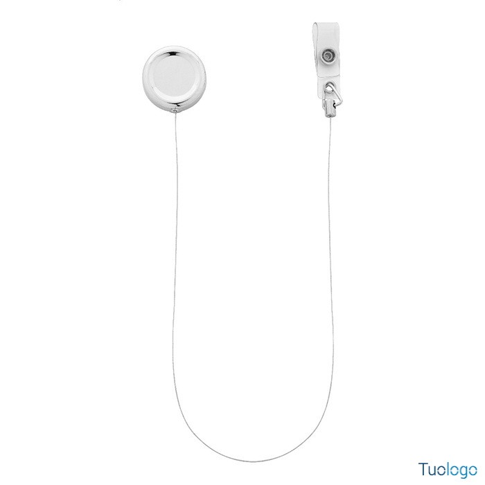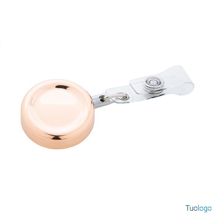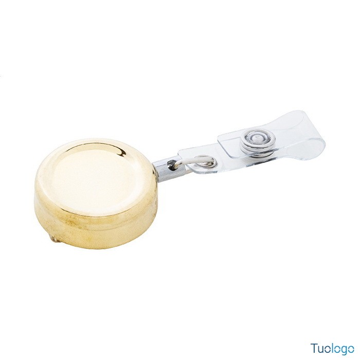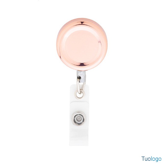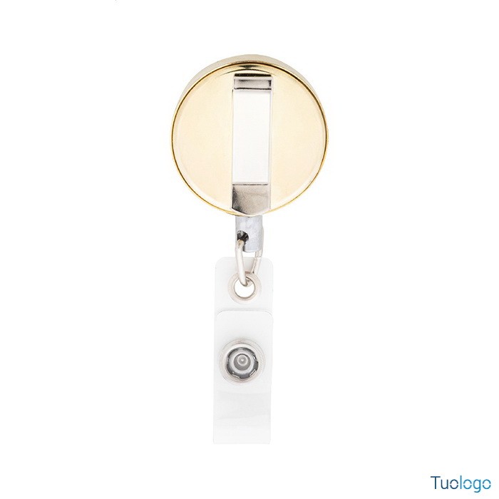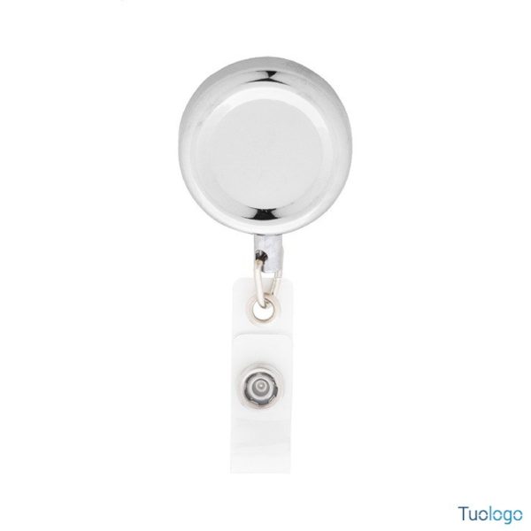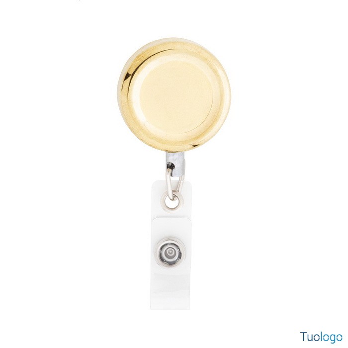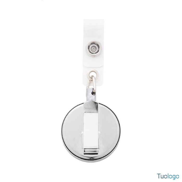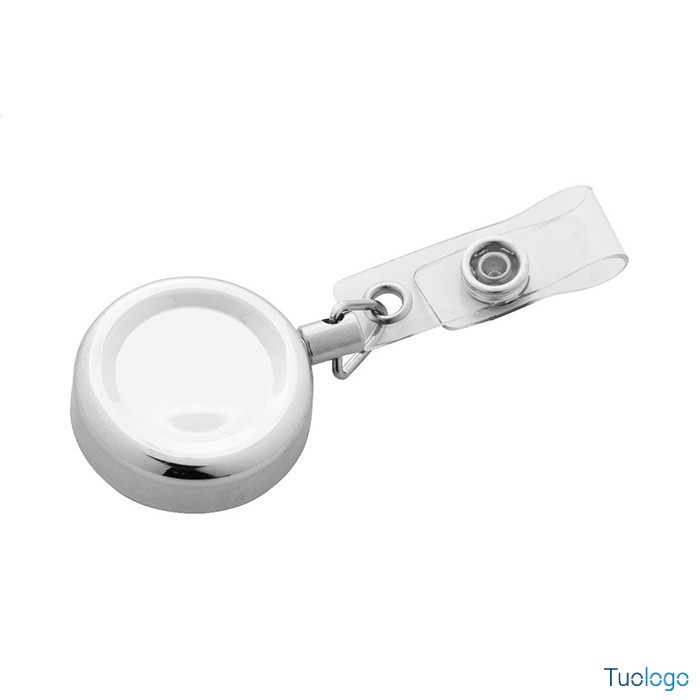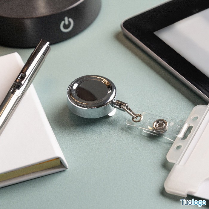 Porta badge Nadin. Esclusivo porta badge in metallo con finitura metallica lucida. Chiusura con bottone a pressione, cordoncino telescopico e clip in metallo. Dimensioni: cm 3x1.