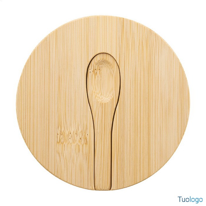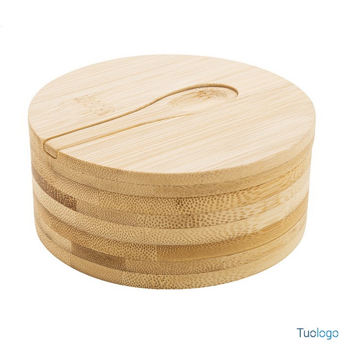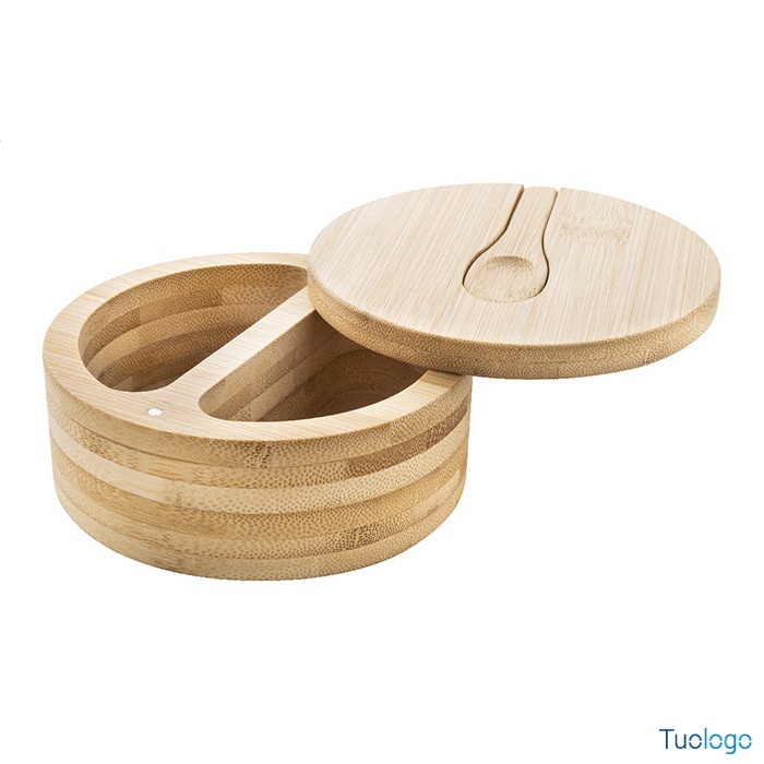 Porta sale e pepe Sepu. Contenitore porta sale e pepe in bamboo con due scomparti e coperchio a rotazione magnetica e cucchiaio di servizio. Dimensioni: cm 11,5x5.