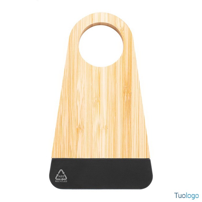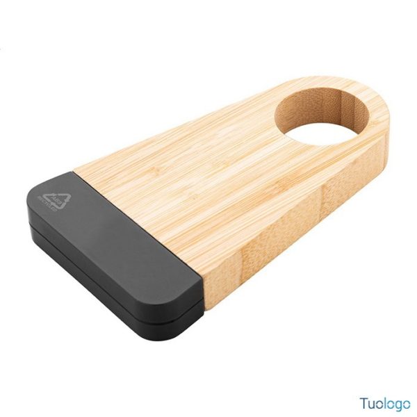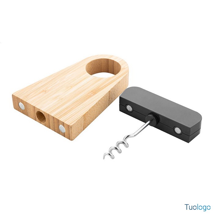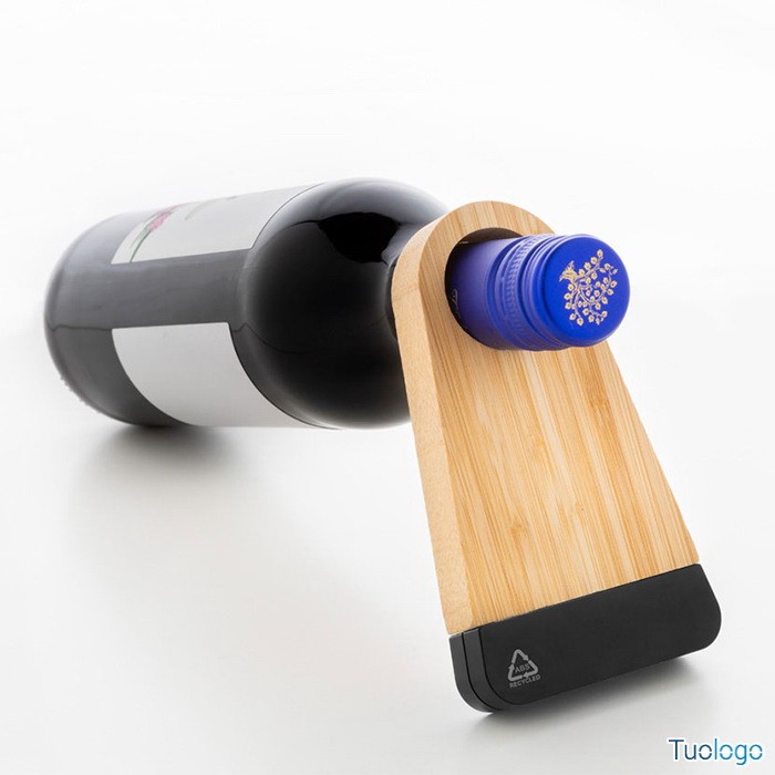 Portabottiglie in bamboo con cavatappi Una. Portabottiglie in bamboo e ABS riciclato con cavatappi in acciaio inox. Dimensioni: diam cm 13,4×7,8×1,7.