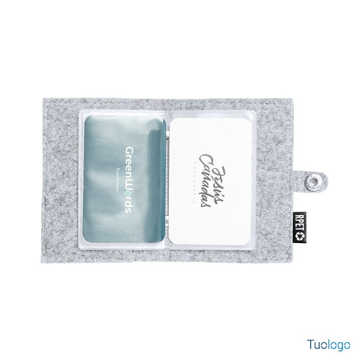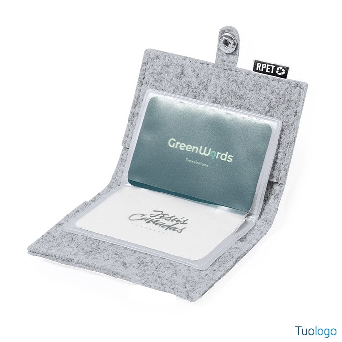 Portacarte Tavira. Porta carte di credito in feltro RPET con 6 scomparti, chiusura a pressione ed etichetta RPET. Dimensioni: cm 11x8x15.