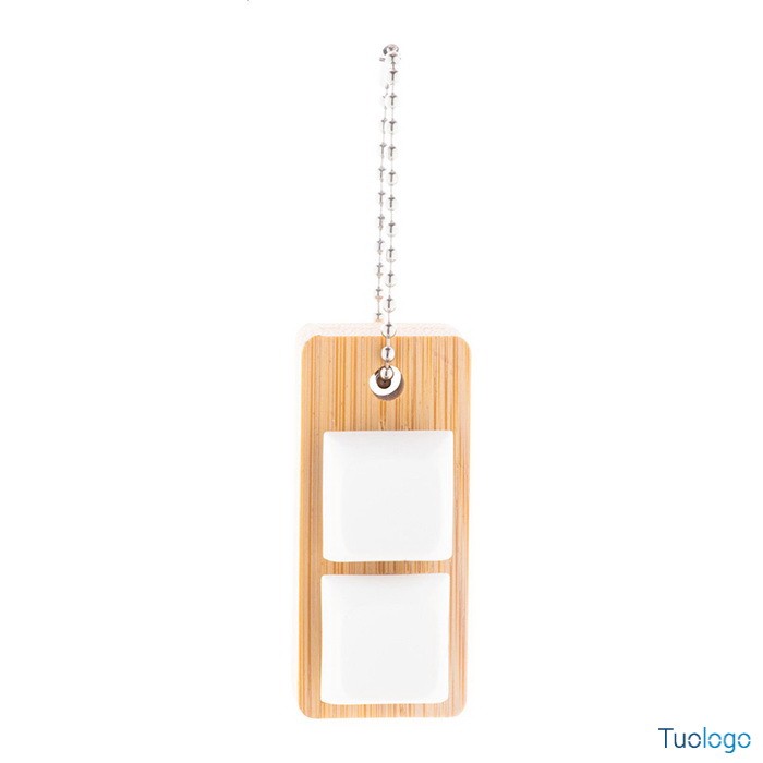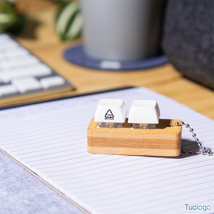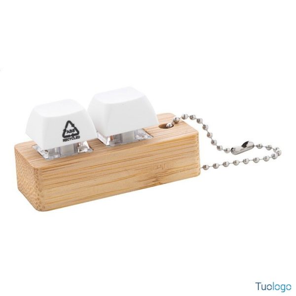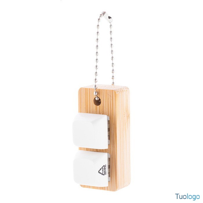 Portachiavi antistress Tofino. Portachiavi in bambù con catenella in metallo e 2 tasti antistress in ABS riciclato che emulano quelli di una tastiera. Dimensioni: diam cm 5,4×2,5×3,1.