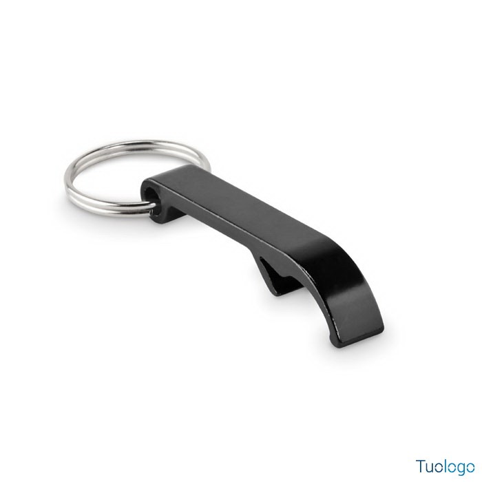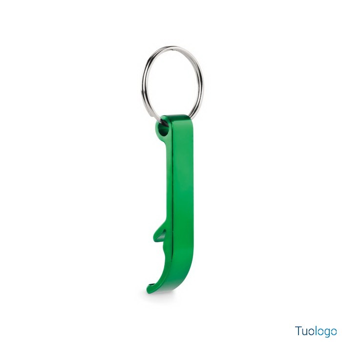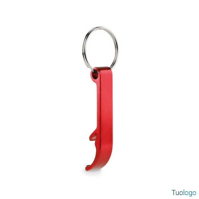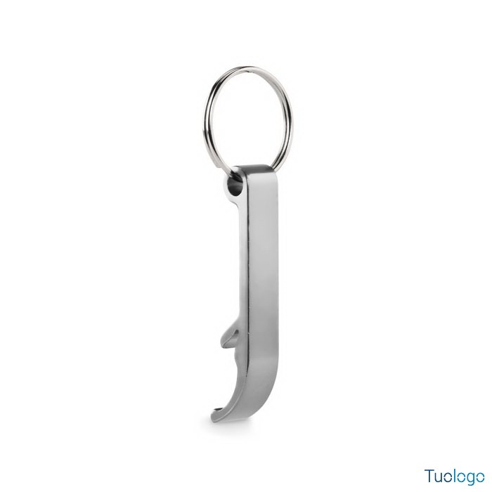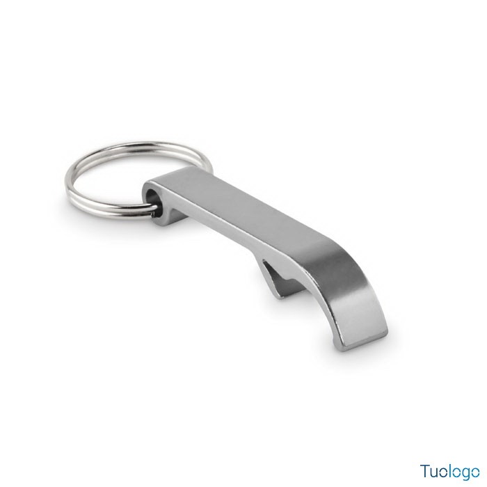Portachiavi apribottiglie eco Bacugno. Apribottiglie in alluminio riciclato con finitura lucida e anello portachiavi. Dimensioni: cm 7,5x2,5x1,3.