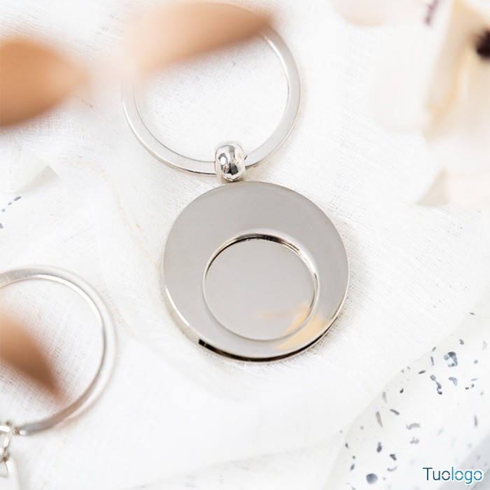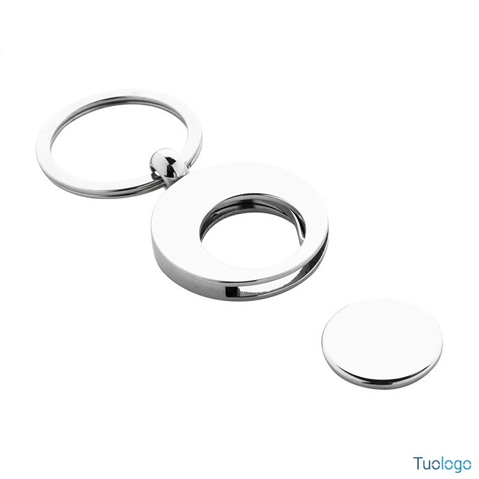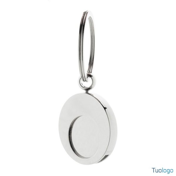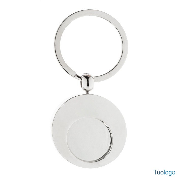 Portachiavi in metallo Bend. Portachiavi in metallo di forma rotonda con moneta per il carrello della spesa. Fornito in scatola di cartoncino kraft. Dimensioni: diam cm 3,6×3,6×0,5.