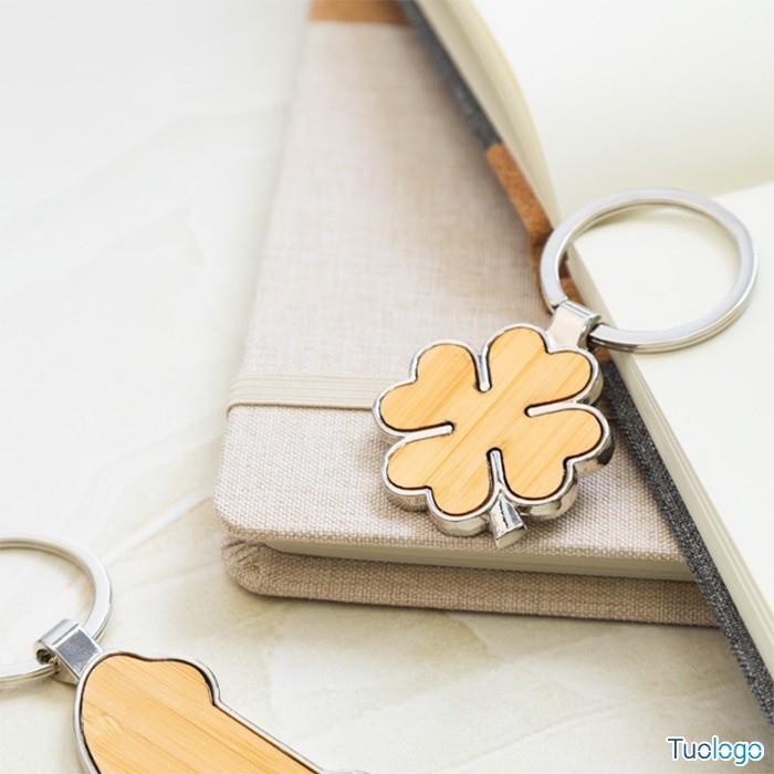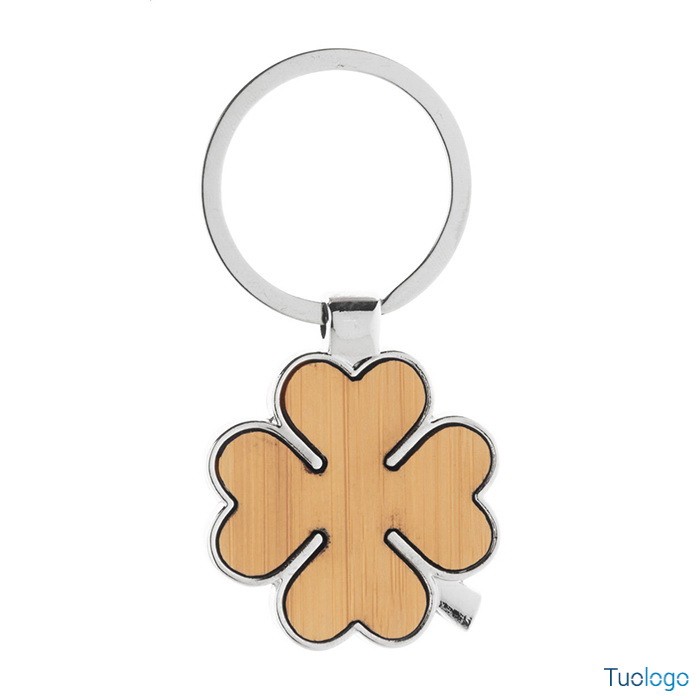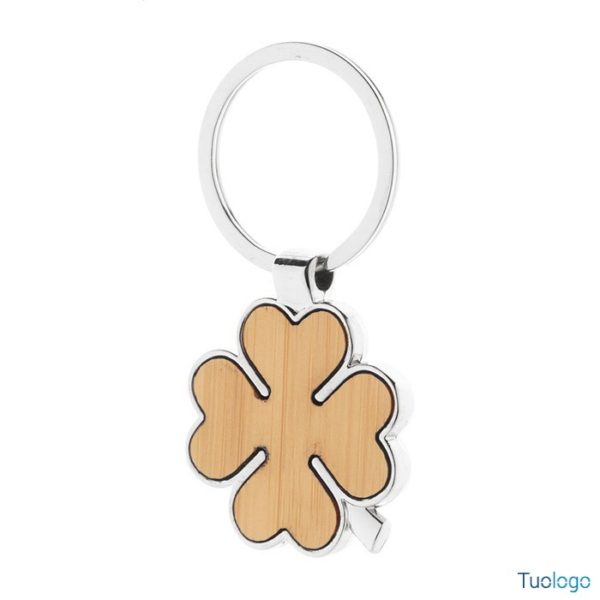 Portachiavi in metallo e bamboo Forks. Portachiavi in metallo a forma di quadrifoglio con inserto in bamboo. Fornito in scatola di cartoncino kraft. Dimensioni: diam cm 35×70×4.
