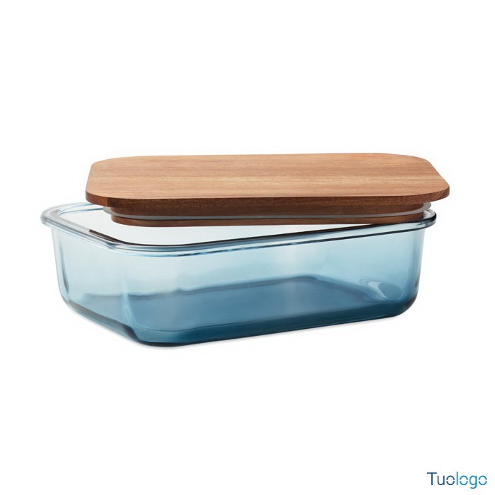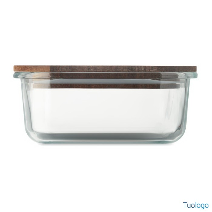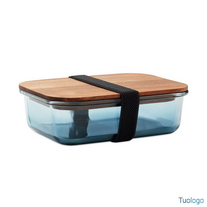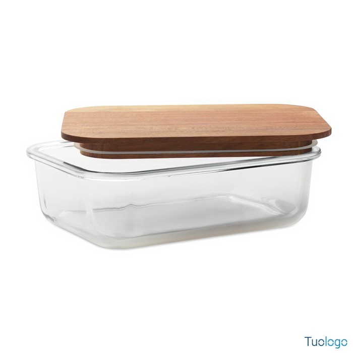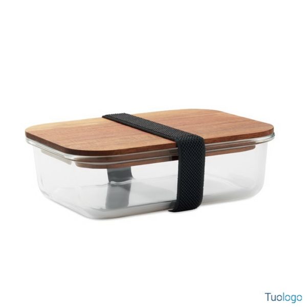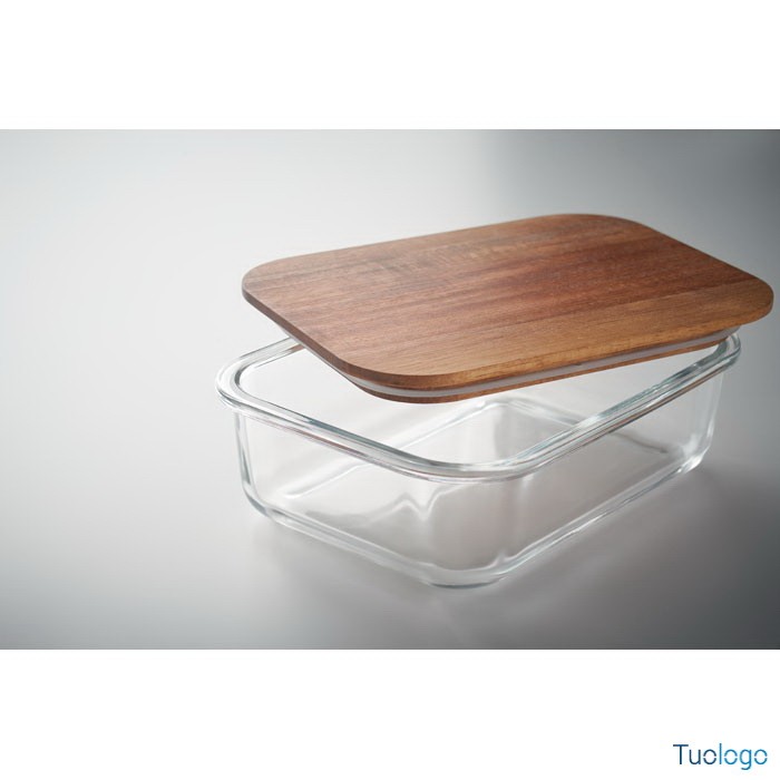 Portapranzo in vetro Tornes. Portapranzo in vetro con coperchio in legno di acacia e chiusura con elastico in RPET. Capacità: 800 ml FSC®-certified. Dimensioni: 12,6x14,5 cm.