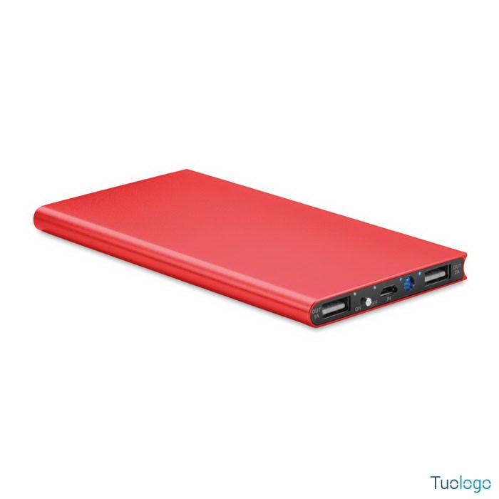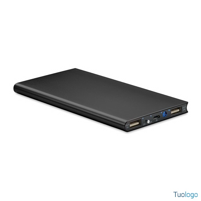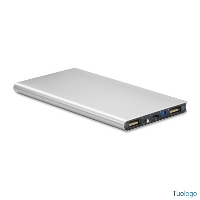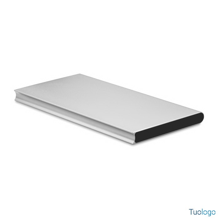 Powerbank 8000 mAh Felino. In alluminio riciclato. Cavo USB con micro USB incluso. Output DC5V/1A e DC5V/2A. Dimensioni: cm 15x7,5x0,9.