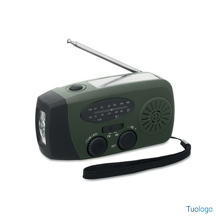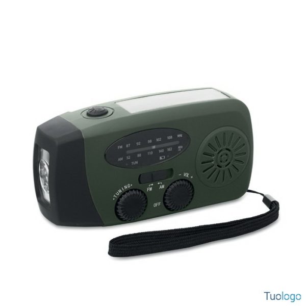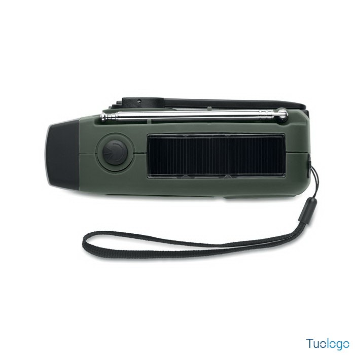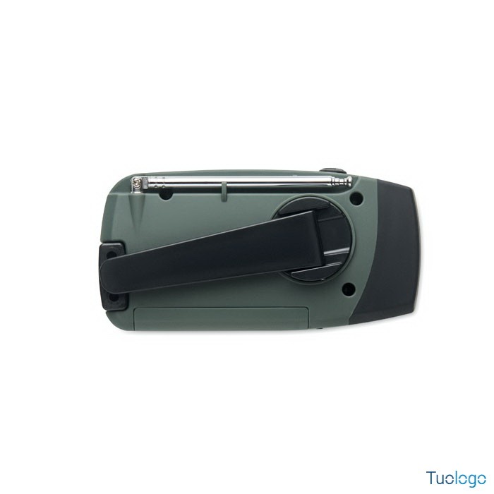 Radio portatile con torcia Manger. Radio portatile AM/FM in ABS con torcia a LED e un powerbank da 1200 mAh per la ricarica di emergenza. Autoalimentata con energia solare e manovella. Dimensioni: 13x5x6 cm.