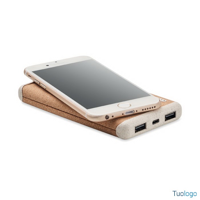 Ricarica wireless e powerbank Balatina. Ricarica wireless da 10W e power bank da 10.000 mAh in sughero e dettagli in ABS-paglia di grano. Supporta la tecnologia di ricarica rapida. Ingresso/uscita: Tipo-C.Dimensioni: cm 13,3x6,9x1,6.
