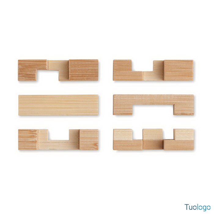 Rompicapo in bamboo. Puzzle rompicapo, in confezione di carta riciclata. Dimensioni: cm 4,5x4,5.