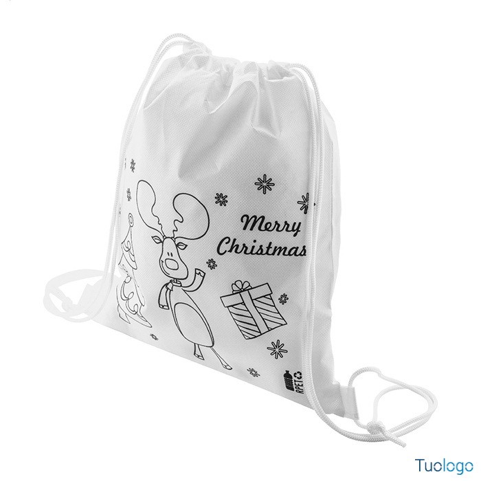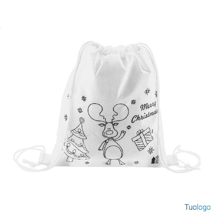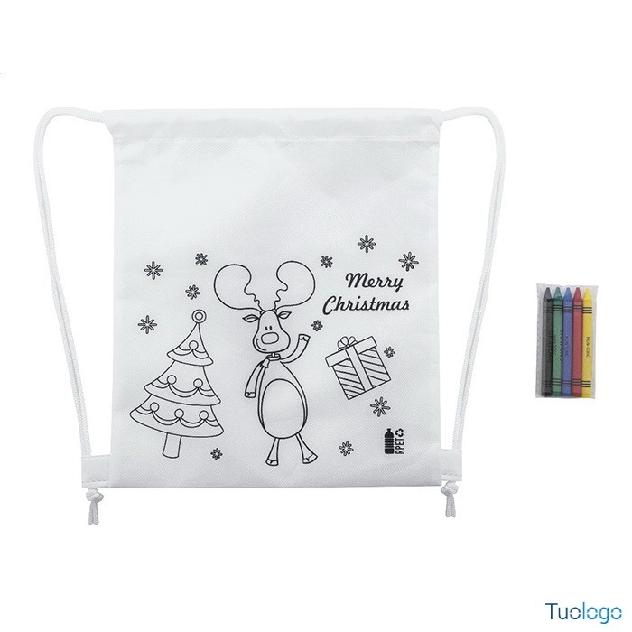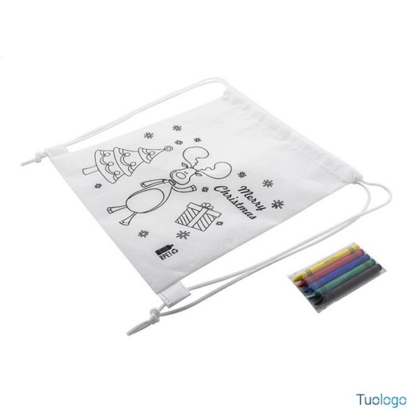 Sacca natalizia Edzell. Sacca a tema natalizio da colorare in tessuto non tessuto RPET con 5 pastelli. Dimensioni: cm 25x30.