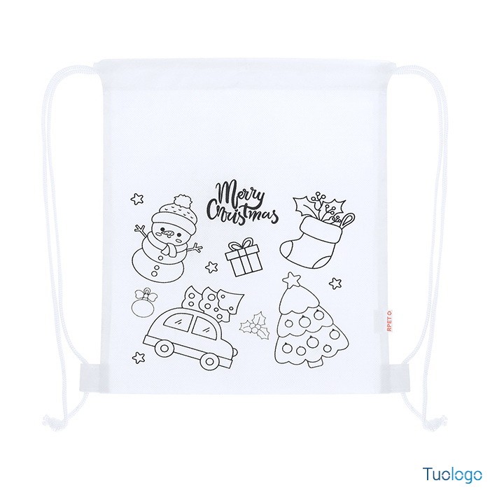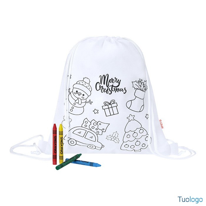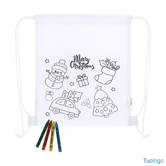 Sacca natalizia Tyka. Sacca per bambini con decorazione natalizia da colorare in tessuto non tessuto RPET e 4 pastelli. Dimensioni: mm 250x300.