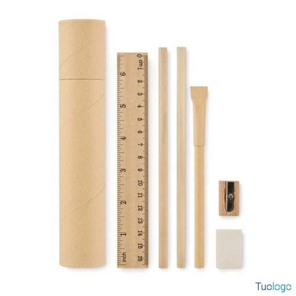 Scatola in carta con kit di cancelleria Carmen. Scatola in tubo di carta con 2 matite, 1 penna in cartone, 1 temperino in legno e 1 gomma. Dimensioni:cm Ø3.6x19.5.