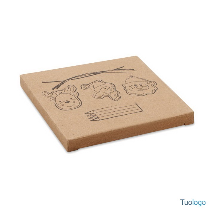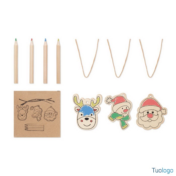 Set 3 decorazioni Natale da colorare. Set di 3 decorazioni natalizie in legno da colorare. 4 matite incluse. In scatola di carta kraft. Dimensioni: cm 9x9.