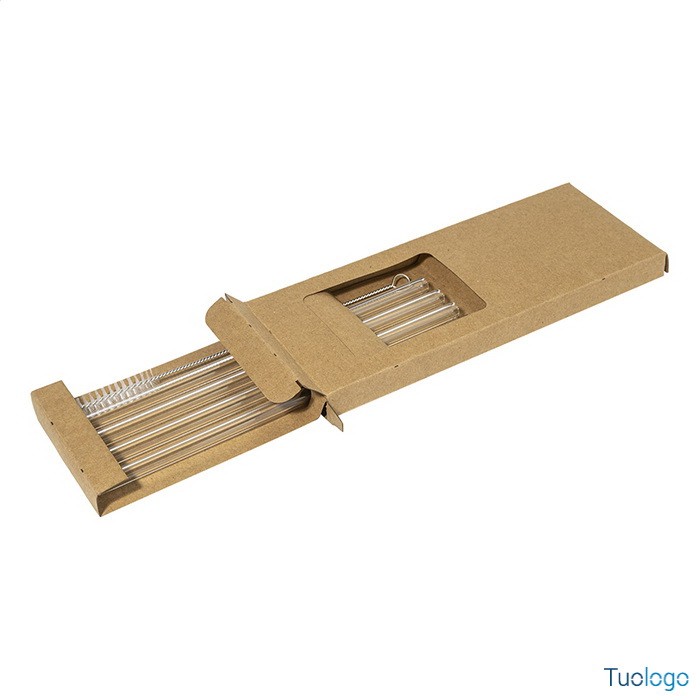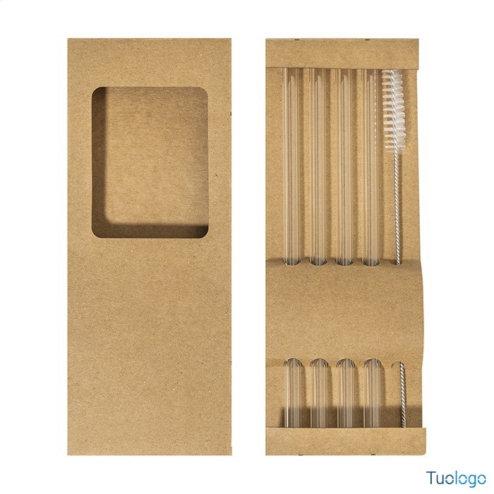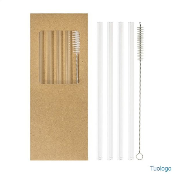 Set 4 cannucce riutilizzabili Astaf. Set di 4 cannucce riutilizzabili in vetro borosilicato con spazzolino per la pulizia. Set fornito in una confezione di cartoncino kraft. Dimensioni: cm 8×20,5×1,5.