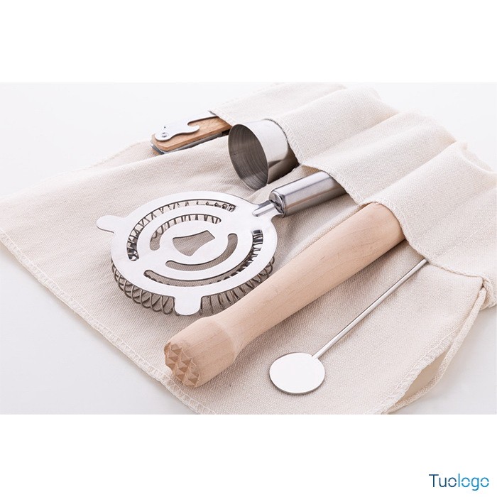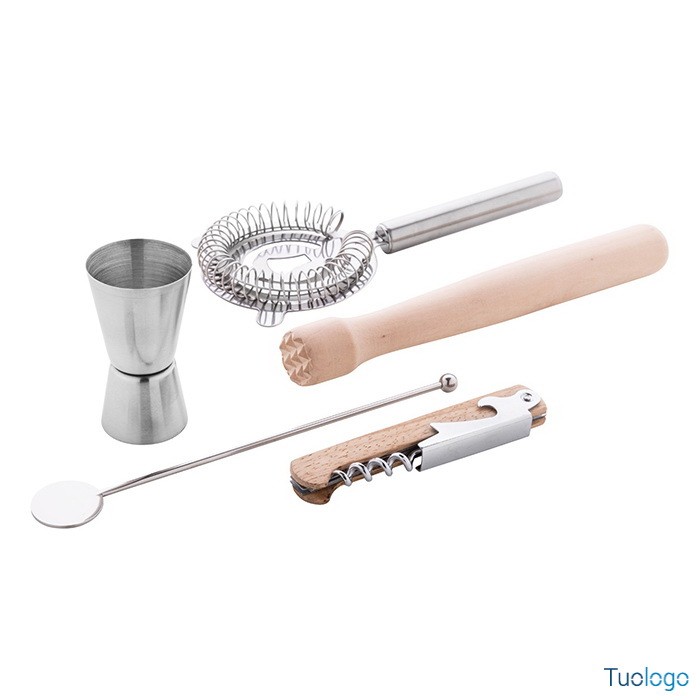 Set da cocktail Sarsini. Set da cocktail composto da 5 pezzi contenuti in confezione avvolgibile in cotone. Comprende: jigger, colino, cucchiaio, cavatappi e pestello. Dimensioni: diam cm 26×23.