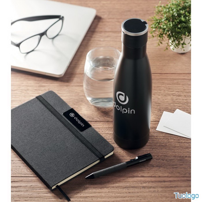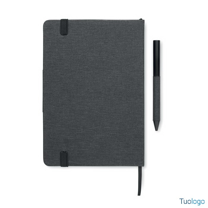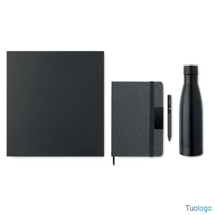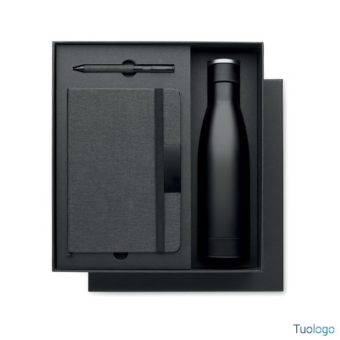 Set da regalo Oletta. Set regalo da 3 pezzi: notebook A5 con copertina rigida in RPET. Elastico di chiusura, segnapagina e portapenne. Penna a sfera, borrraccia in acciaio inossidabile. Dimensioni: cm 30x8x28.