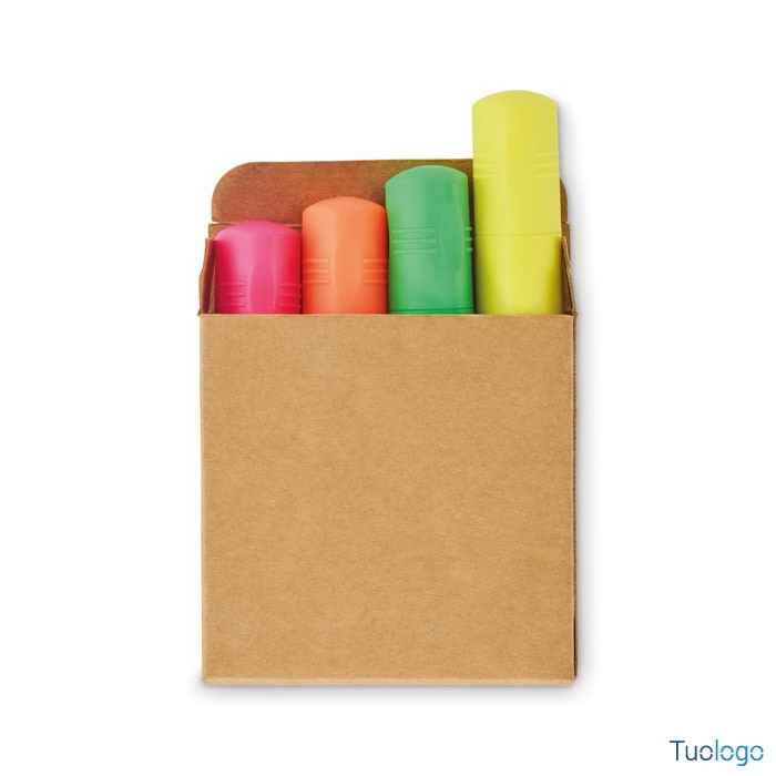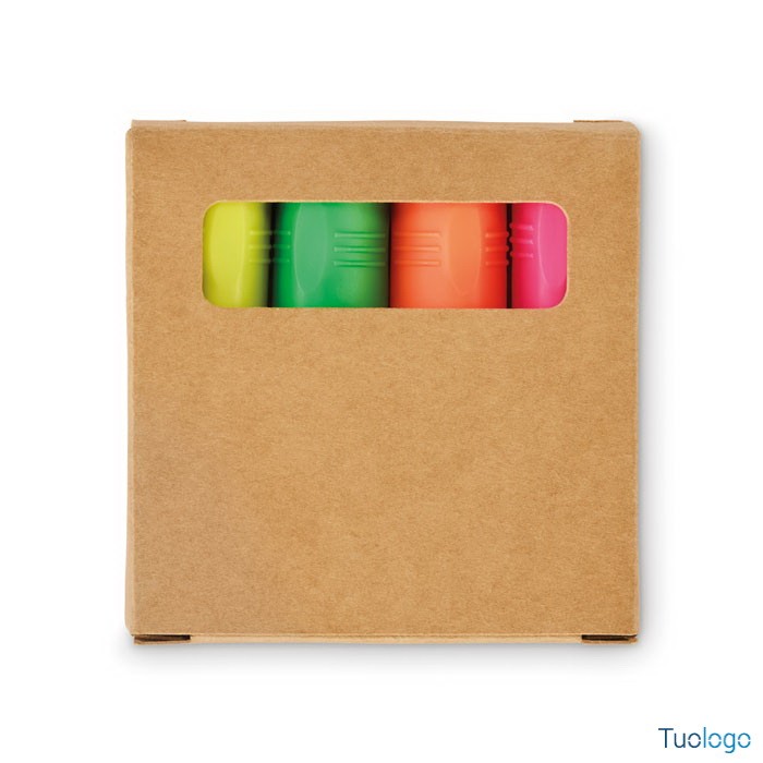 Set di 4 evidenziatori Beravina. Set di 4 evidenziatori in scatola kraft. Dimensioni: cm 7x7x1.8.