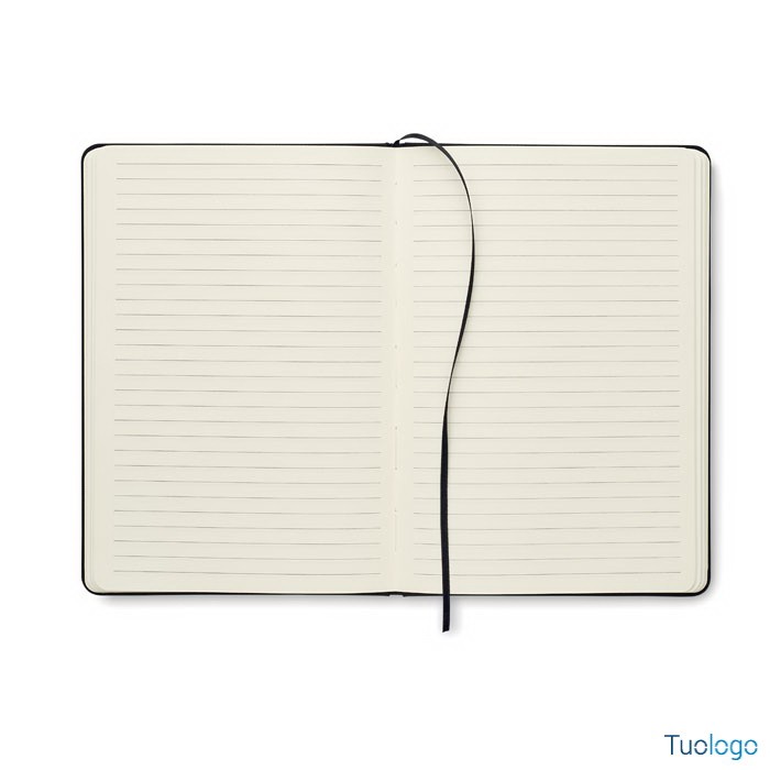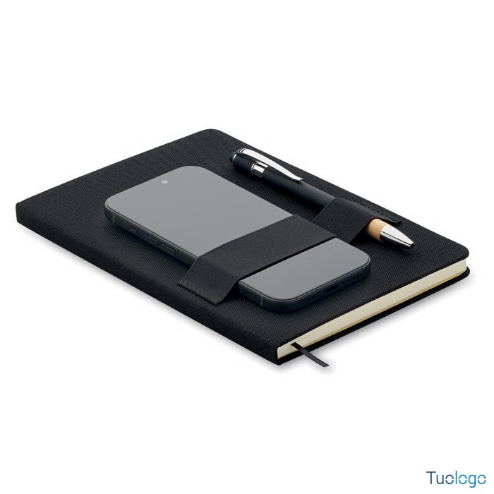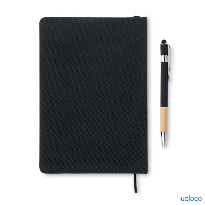 Set di notebook A5 con copertina rigida Jafa. Set di notebook A5 con copertina rigida in RPET 600D. Elastico anteriore con funzione di portacellulare e passante anteriore con penna a sfera con impugnatura in bamboo. Dimensioni: cm 14.5x1.2x21.