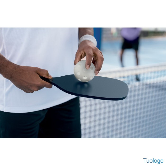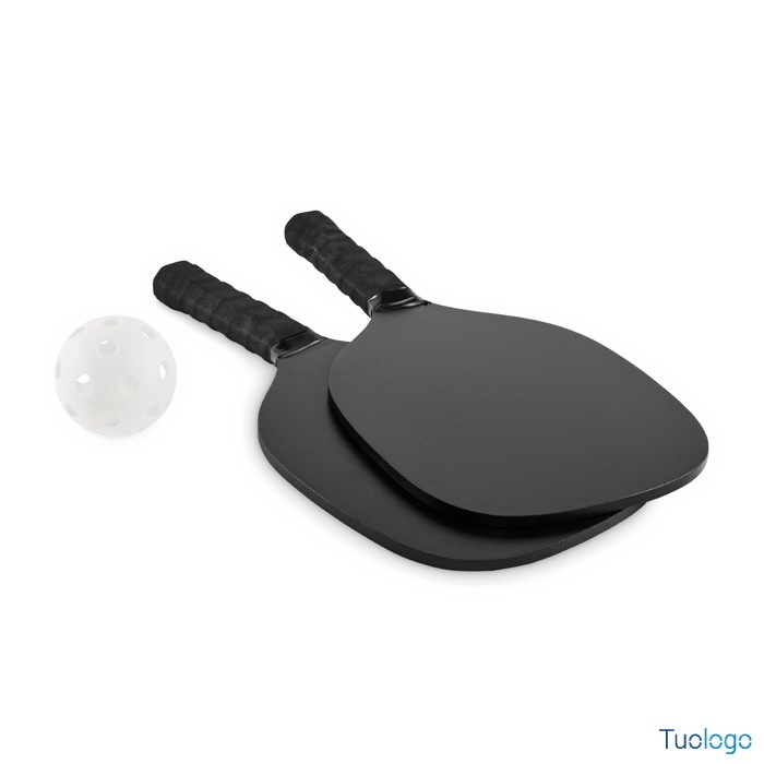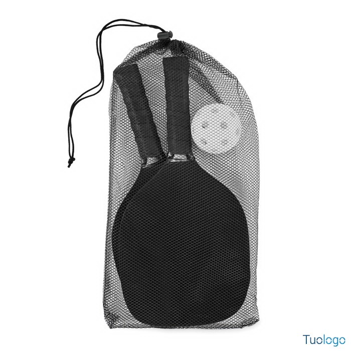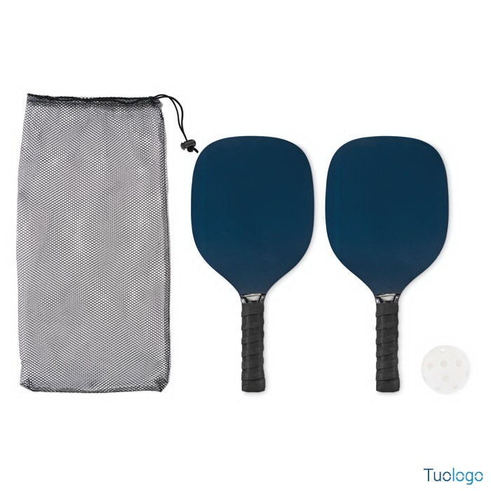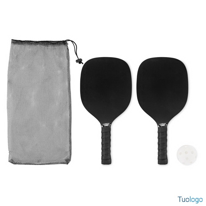 Set di racchette Aigua. Set di racchette da pickleball con 2 racchette in legno e 1 pallina in una custodia in rete RPET con cordoncino. Dimensioni: 40x19,2 cm