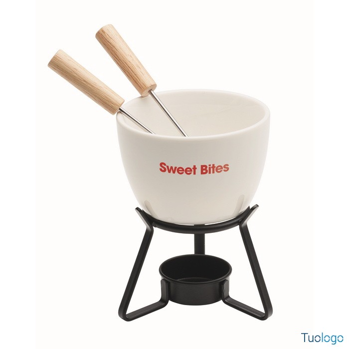 Set fonduta in ceramica Sake. Piccolo set da fonduta in ceramica per due. Incluse due forchette in metallo con manici in legno. Tealight non incluso. 240 ml. Dimensioni: cm 10x10x13.