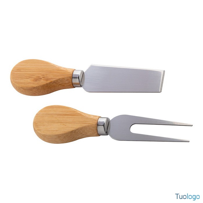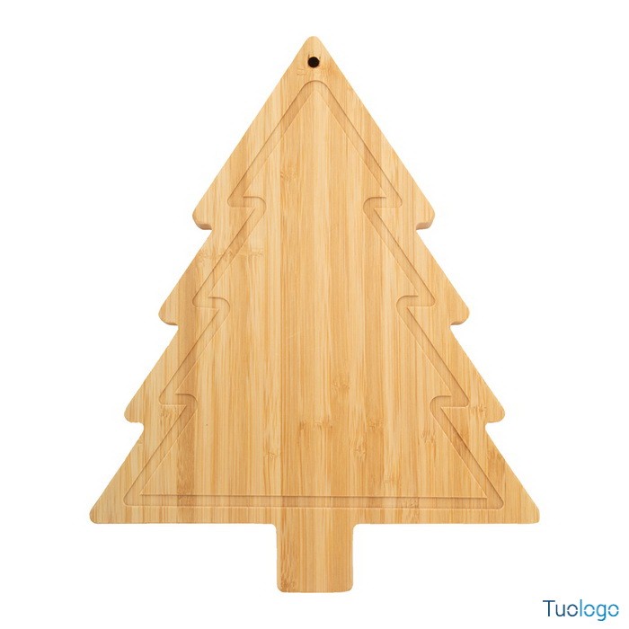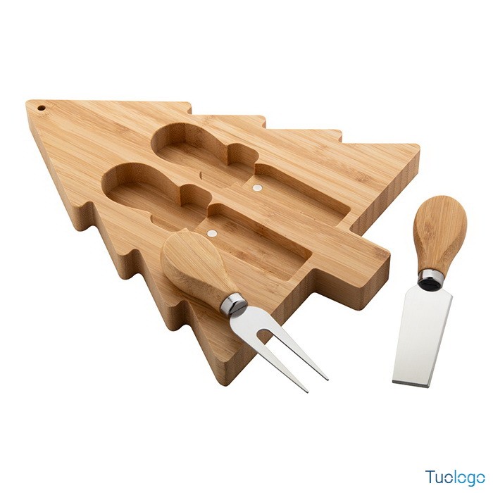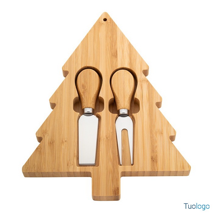 Set formaggi Jerbga. Set composto da 2 coltelli da formaggio in acciaio inox con manico in bambù ed un tagliere a forma di albero di Natale. Confezione scatola in carta kraft. Dimensioni: cm 19,5x25x2.