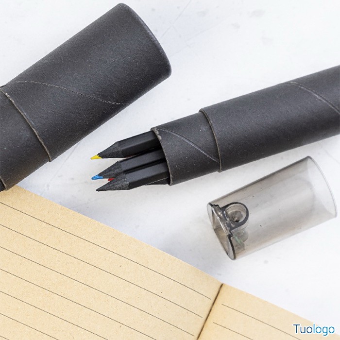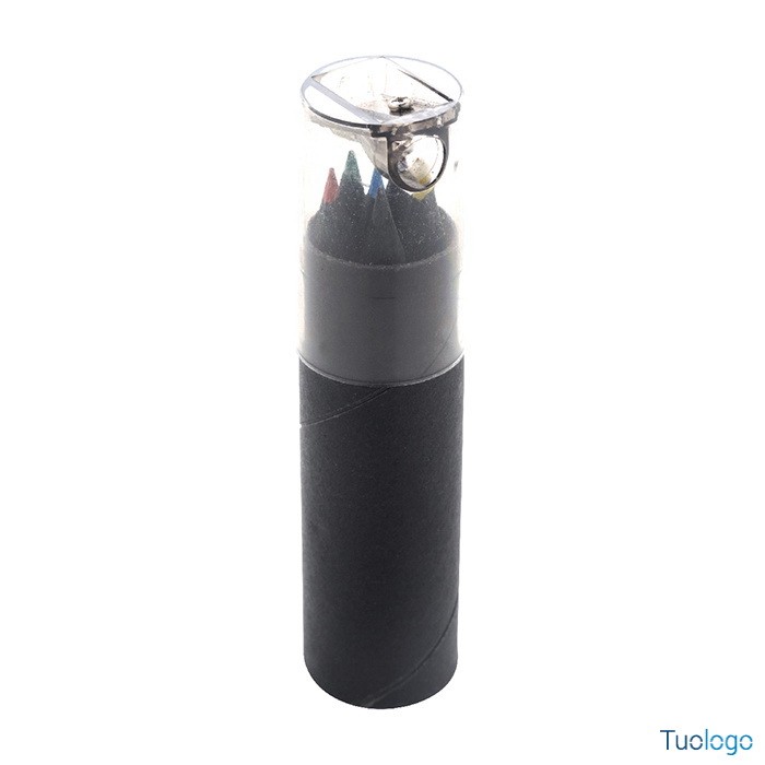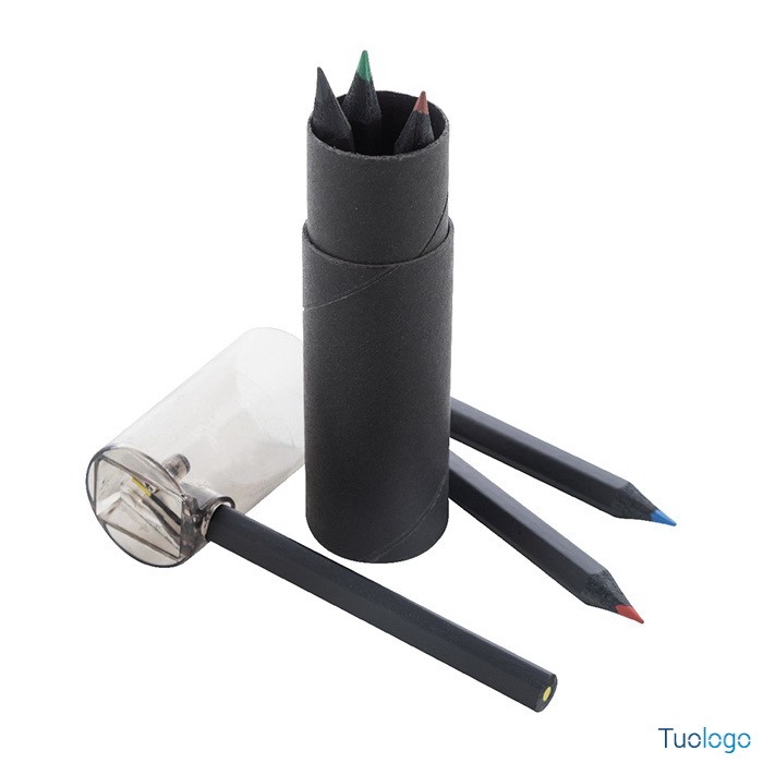 Set matite Caro. Set di 6 matite in legno nero contenute in un astuccio di cartoncino nero e temperamatite in plastica. Dimensioni: diam cm 2,7×10,2.