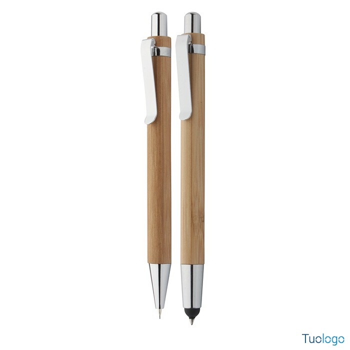 Set penna e matita in bamboo Burnham. Penna a sfera con touch screen e refill blu, matita meccanica da 0,7 mm. In scatola regalo. Dimensioni: cm 2,2x17,2x5,2.