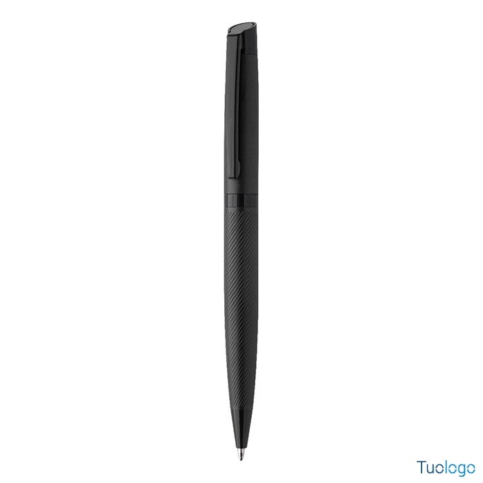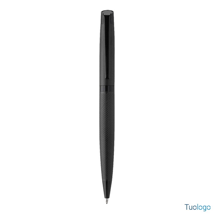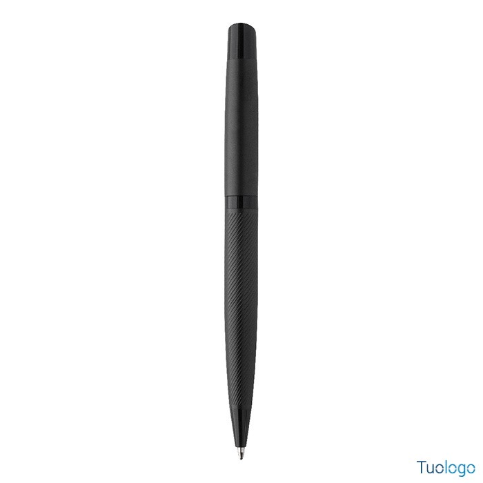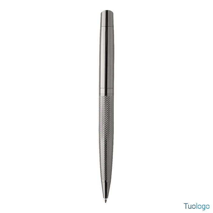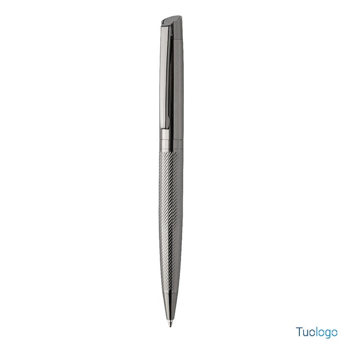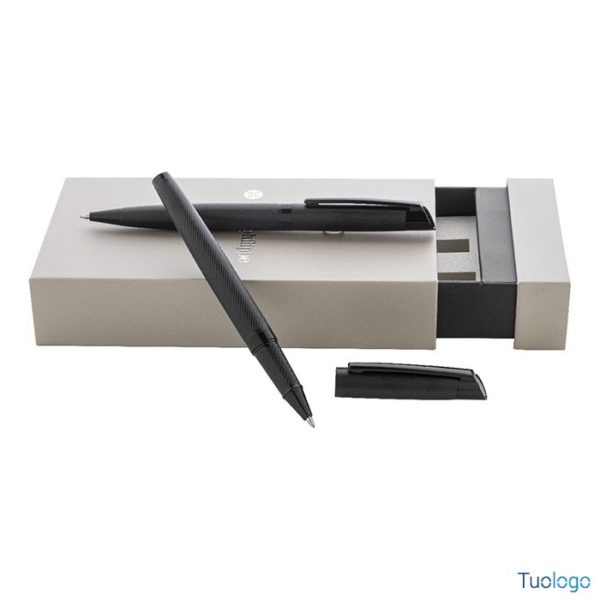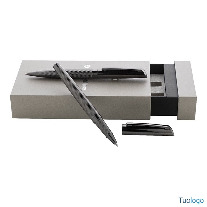 Set penne Degrote. Elegante set composto da una penna a sfera e da una penna roller in metallo con fusto dalla texture diagonale e refill blu. Dimensioni: cm 18,5x8x3.