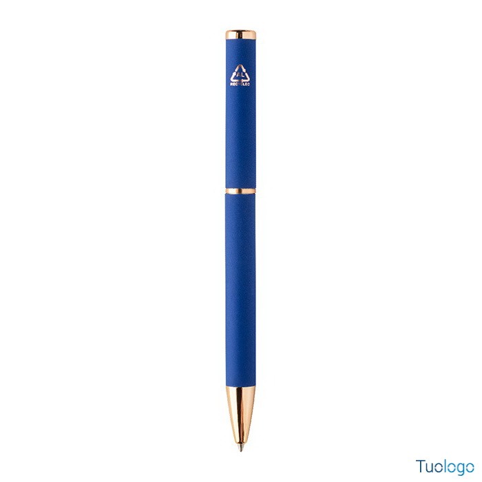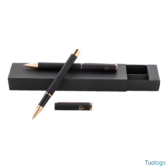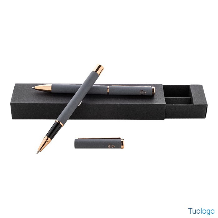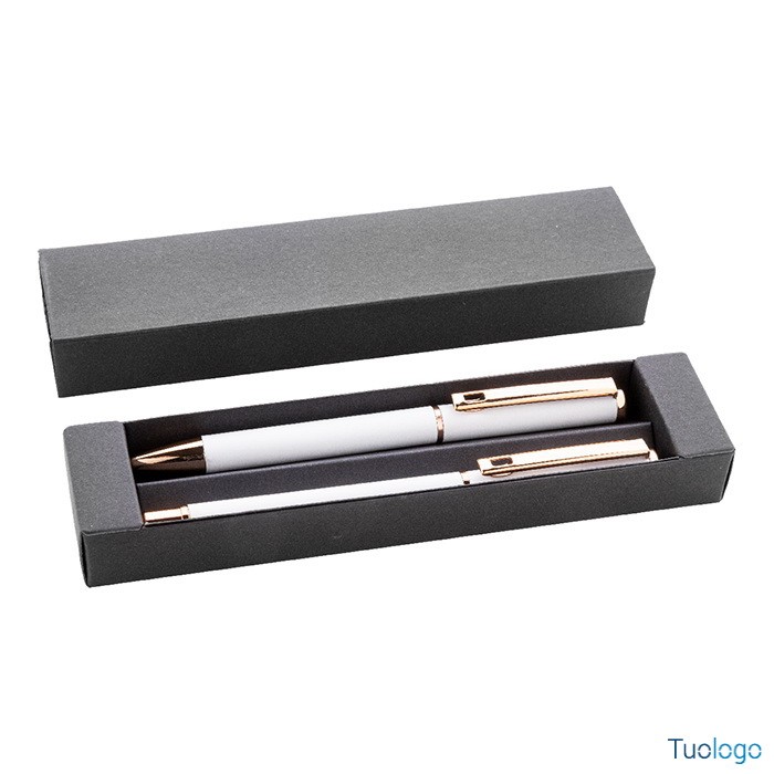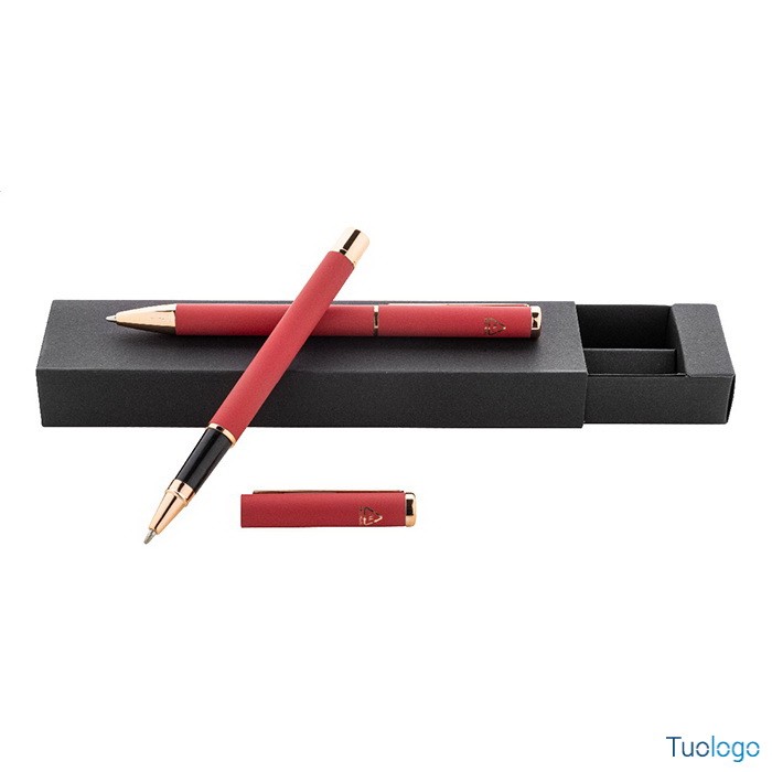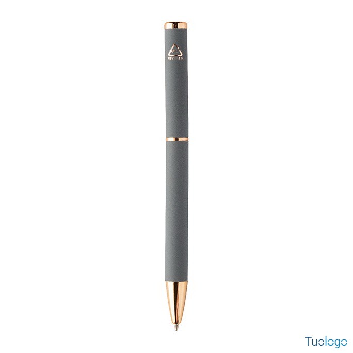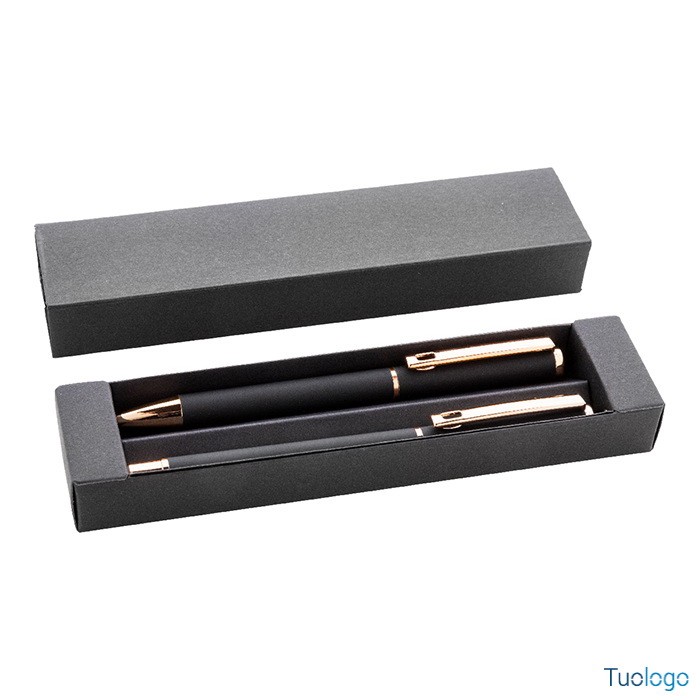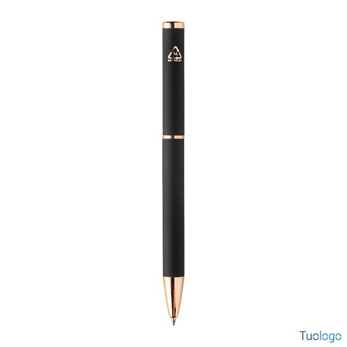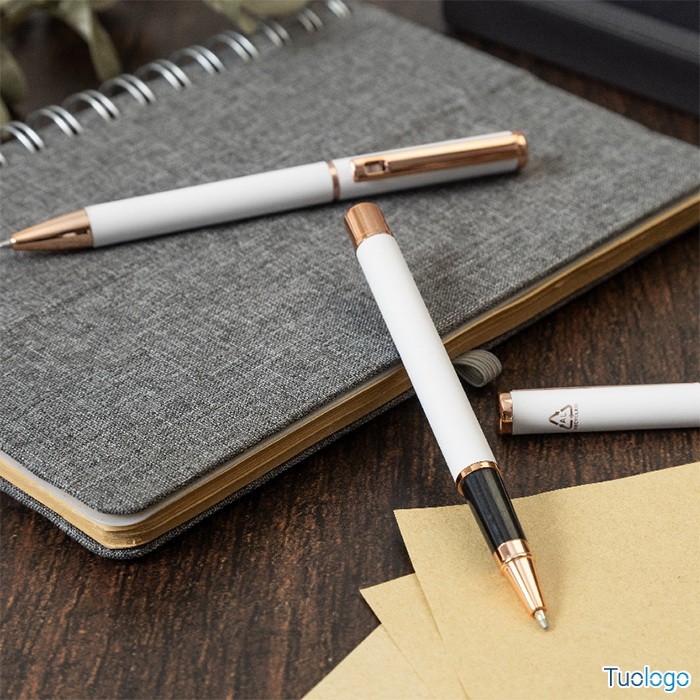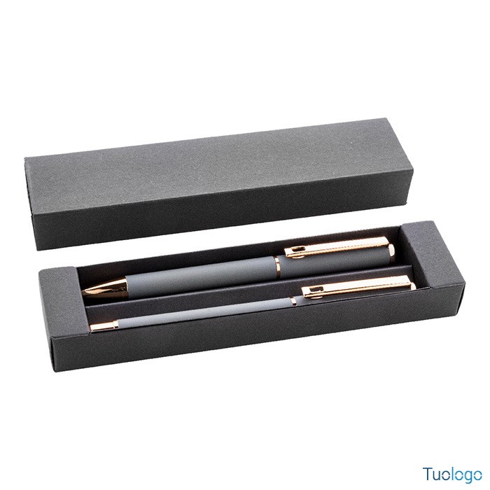 Set penne Vlisseg. Set di penne in alluminio riciclato composto da penna a sfera e penna roller con finitura gommata e dettagli in color oro rosa e refill blu. Dimensioni: cm 17x4x2.