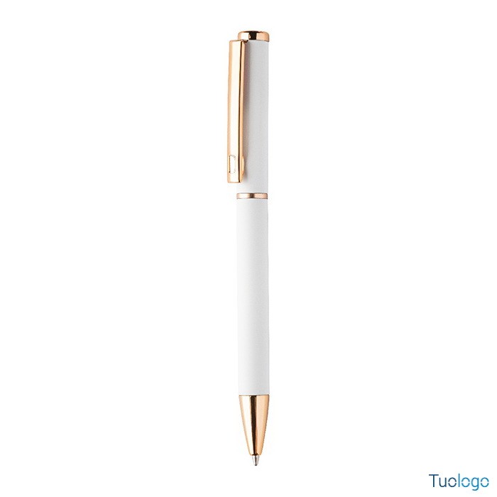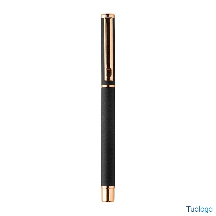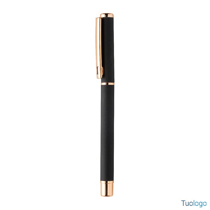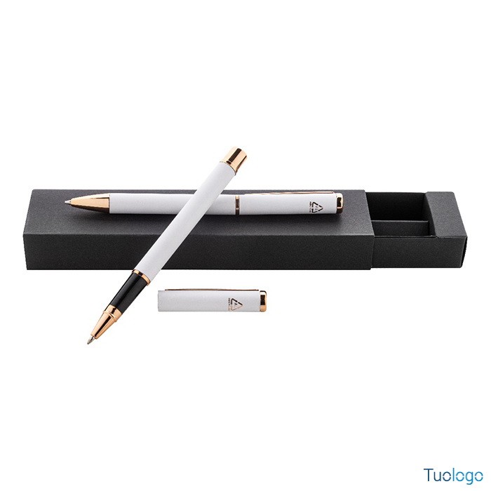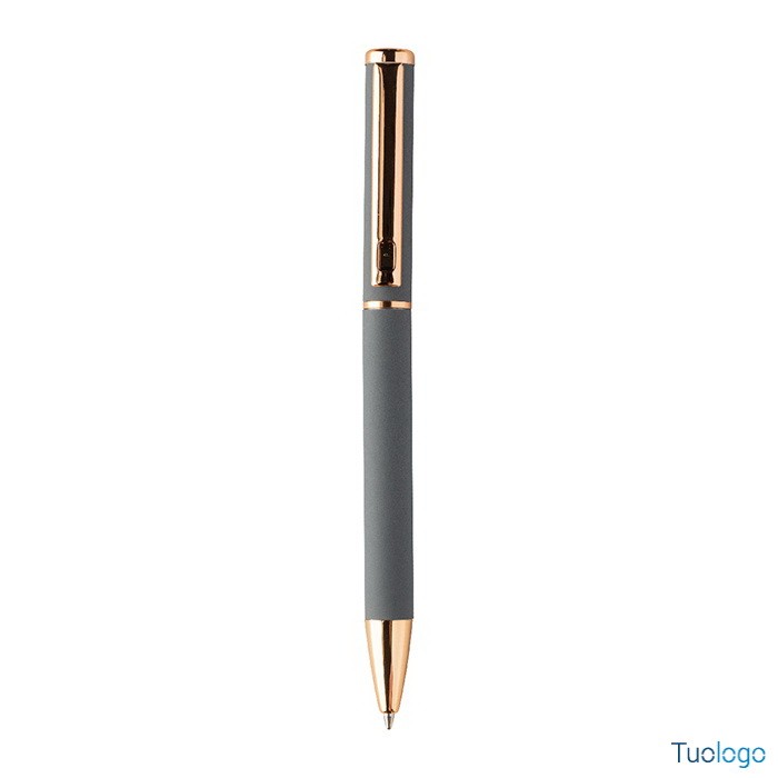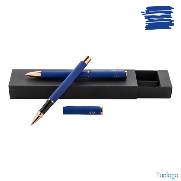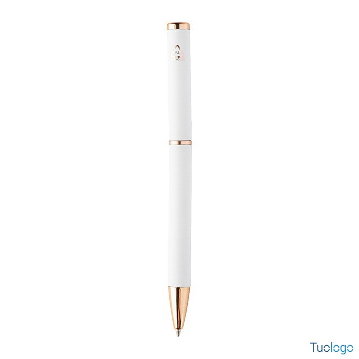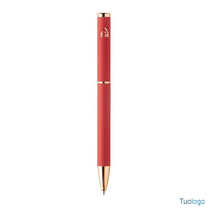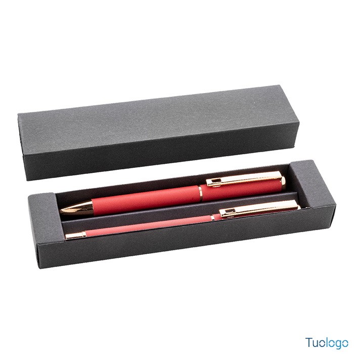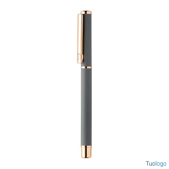 Set penne Vlisseg. Set di penne in alluminio riciclato composto da penna a sfera e penna roller con finitura gommata e dettagli in color oro rosa e refill blu. Dimensioni: cm 17x4x2.