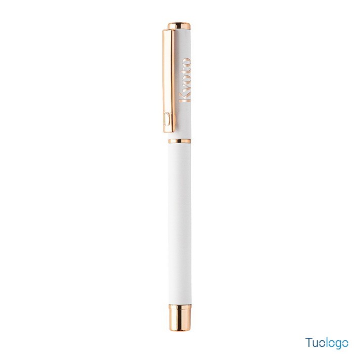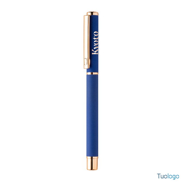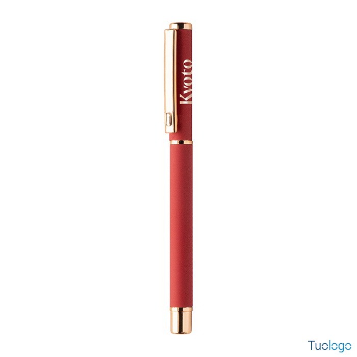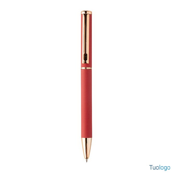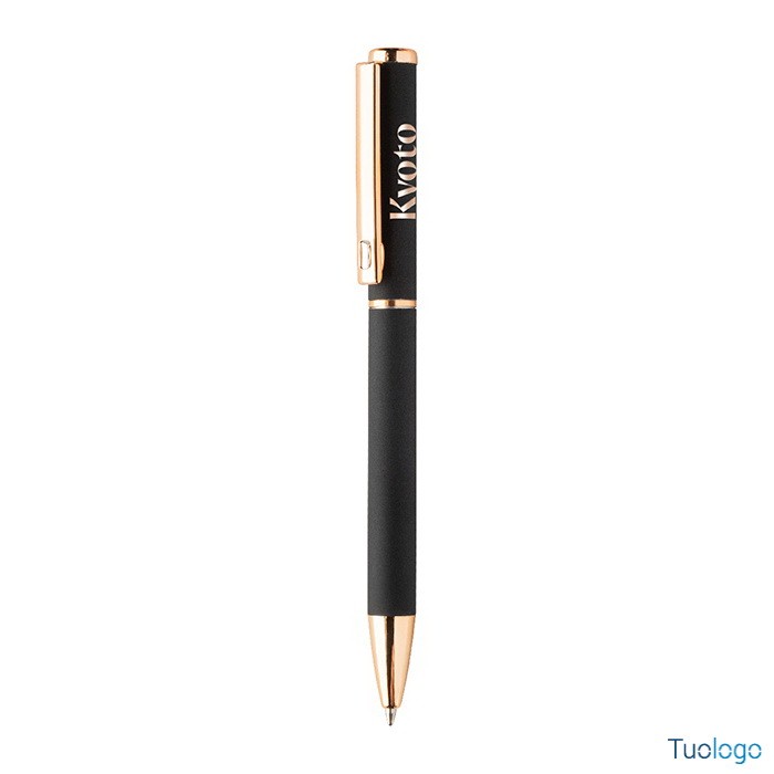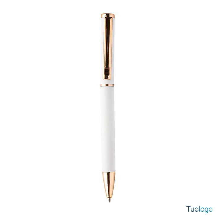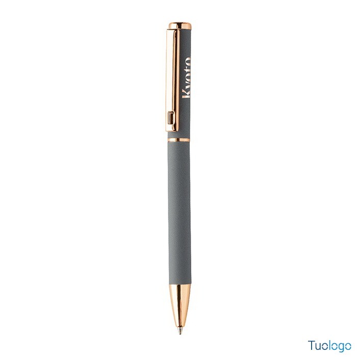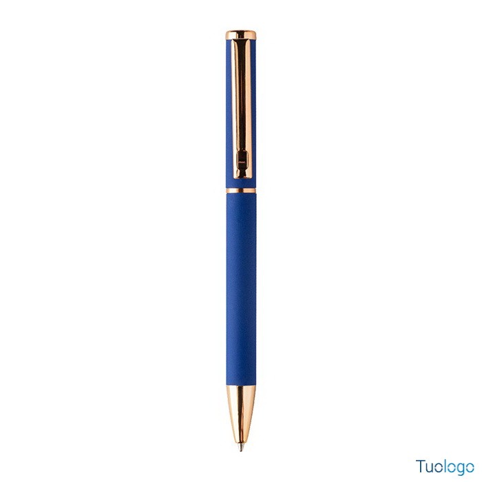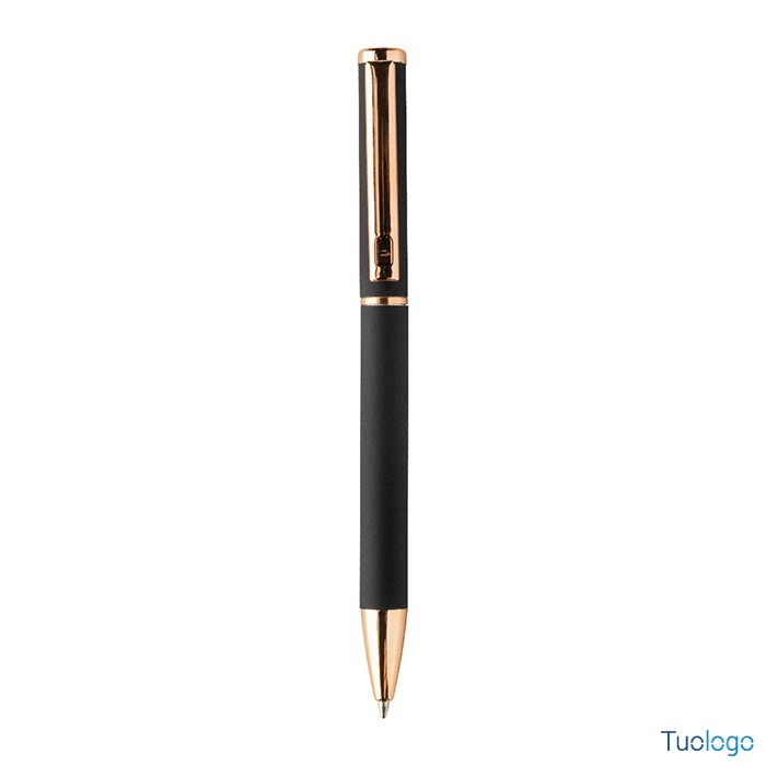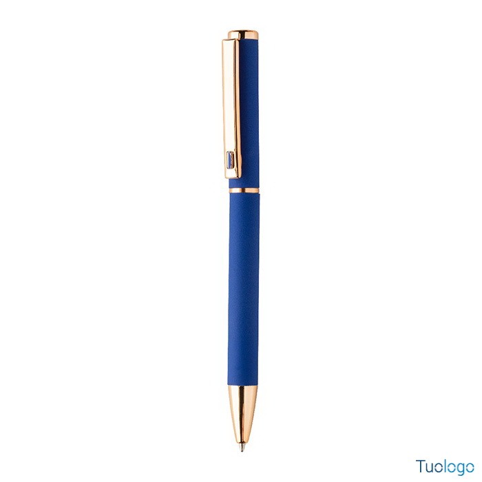 Set penne Vlisseg. Set di penne in alluminio riciclato composto da penna a sfera e penna roller con finitura gommata e dettagli in color oro rosa e refill blu. Dimensioni: cm 17x4x2.