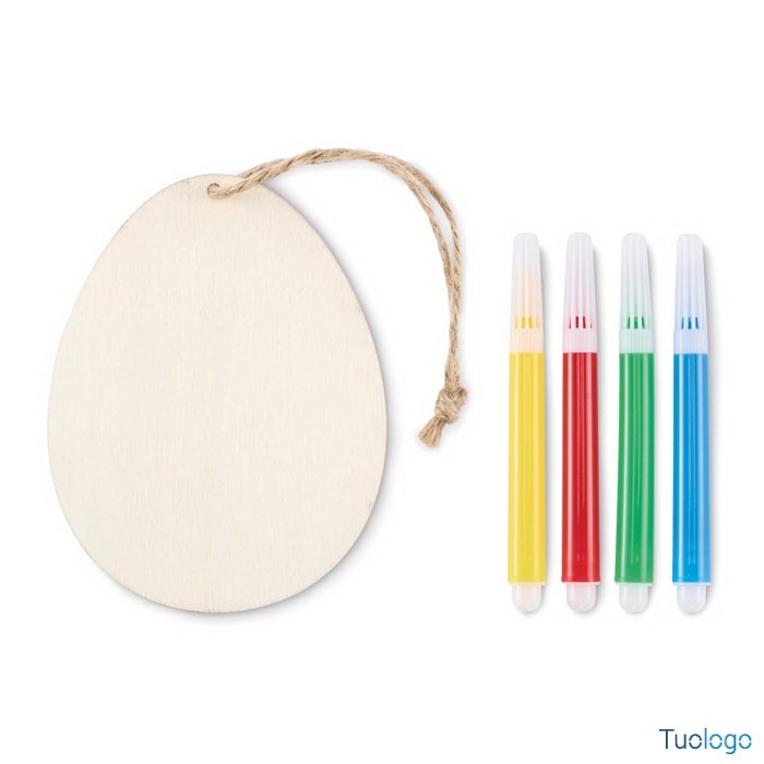 Set per dipingere in legno Carrillo. Set per dipingere le uova in legno con 4 pennarelli e cordoncino di iuta. Dimensioni: cm 10x7.5.