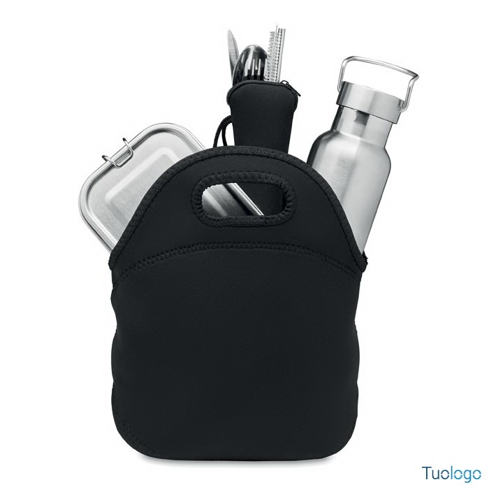 Set porta pranzo Thuras. In borsa in neoprene. Bottiglia a doppia parete in acciaio inox 500 ml porta pranzo 600 ml e posate in sacchetto con cerniera. Dimensioni: cm 27x13x27.