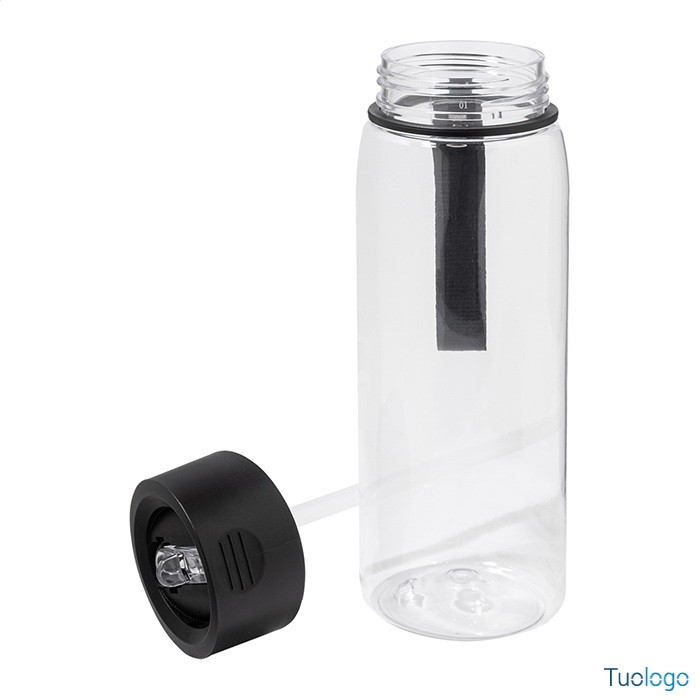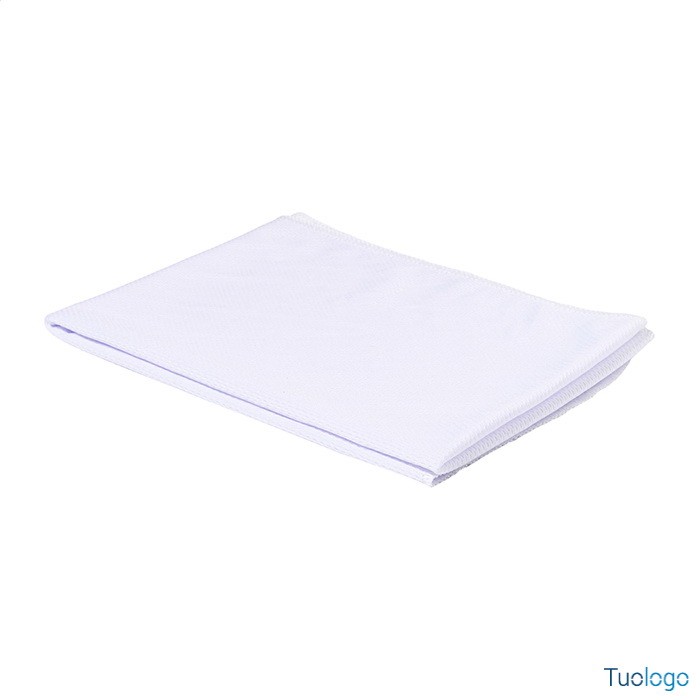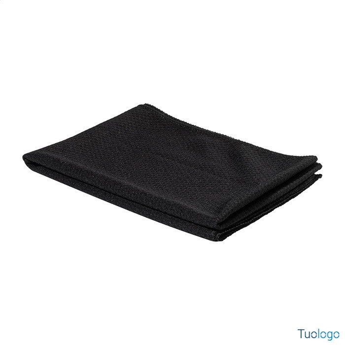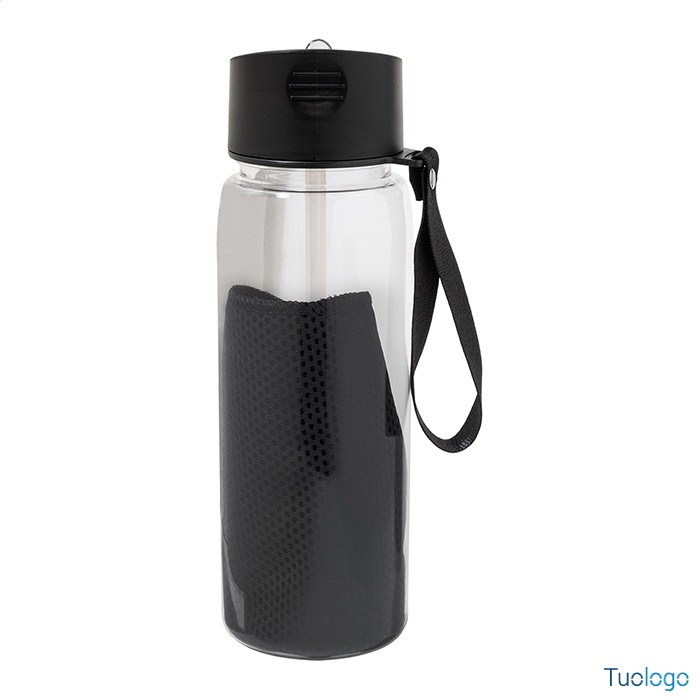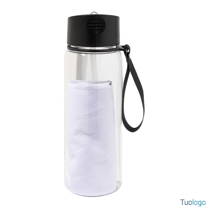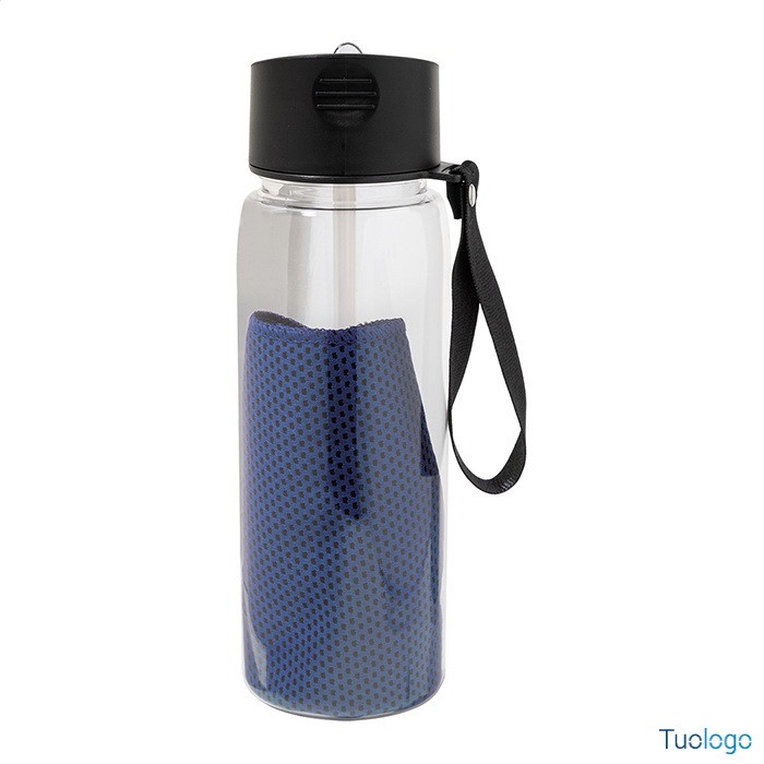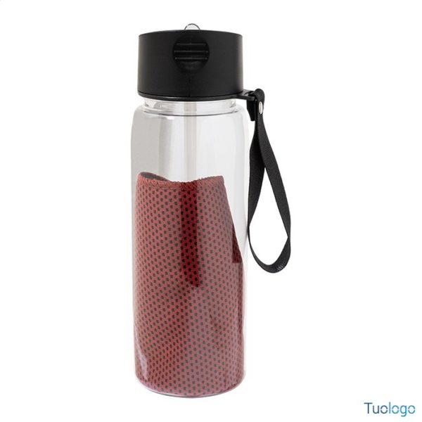 Set sportivo in RPET Areguni. Asciugamano sportivo 30x80cm in poliestere RPET con borraccia in RPET da 800ml, senza BPA. Dimensioni: diam cm 7,7×24. tappo flip-top in PP, cannuccia integrata e tracolla. La borraccia non è idonea a contenere bevande gassate.