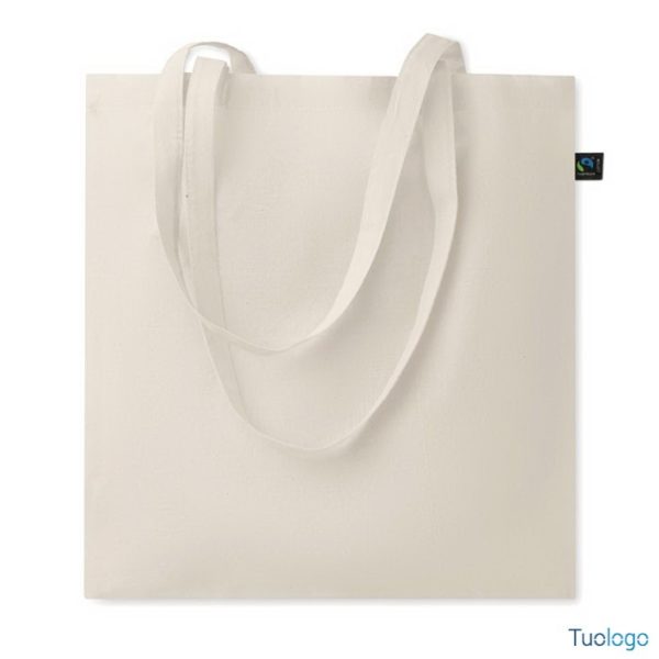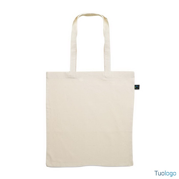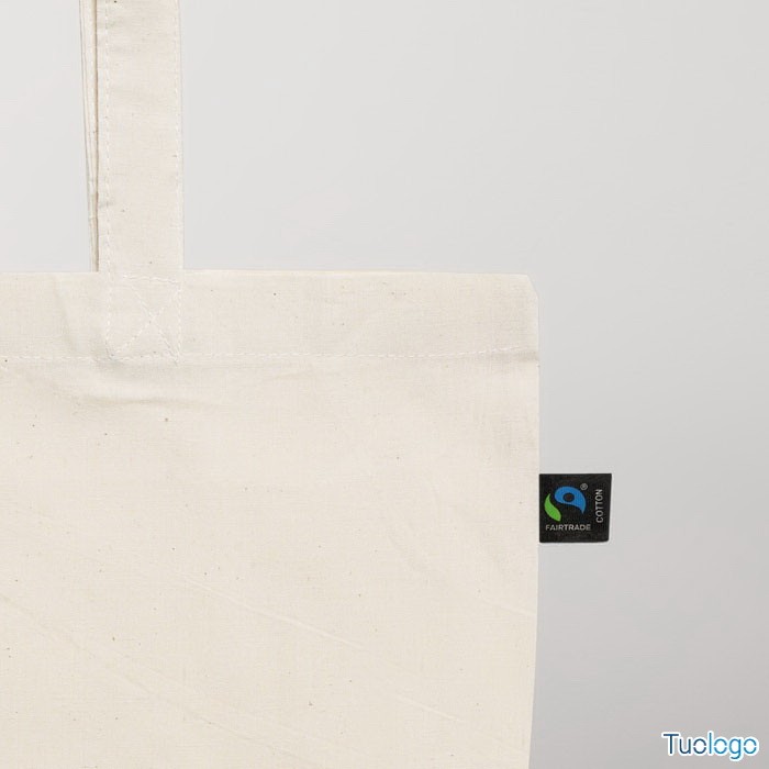 Shopper in cotone naturale 140 gr Fairtrade. In cotone equo e solidale con manici lunghi ed etichetta Fairtrade. Peso 140 gr. Dimensioni: cm 38x42.