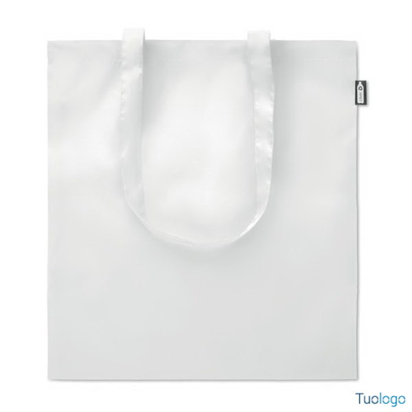 Shopper in RPET Seborga. 190T con manici lunghi. 100 gr. Materiale proveniente da bottiglie riciclate. Dimensioni: cm 38x42.