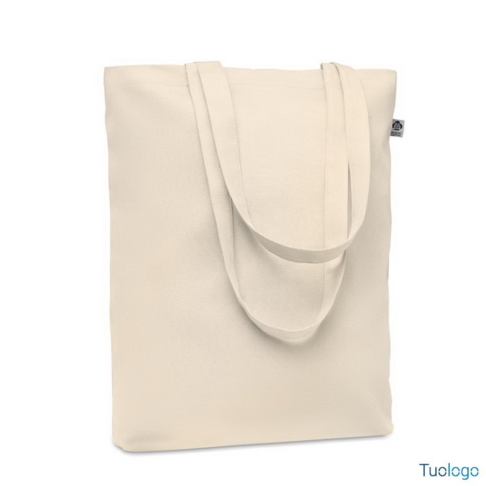 Shopper in tela 270 gr Bustelo. Shopper in tela biologica con manici lunghi e soffietto sul fondo. 270 gr/m². Dimensioni: cm 38x9x42.