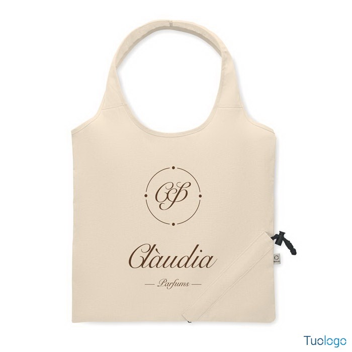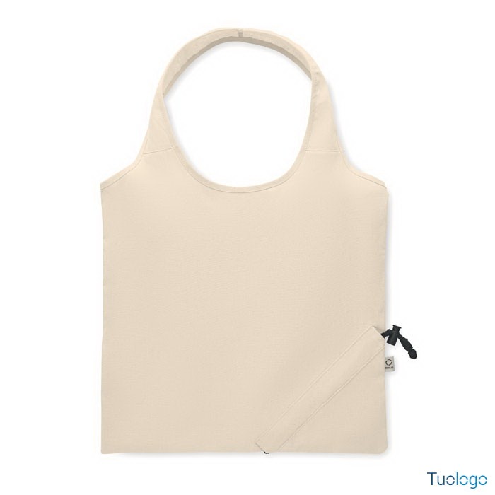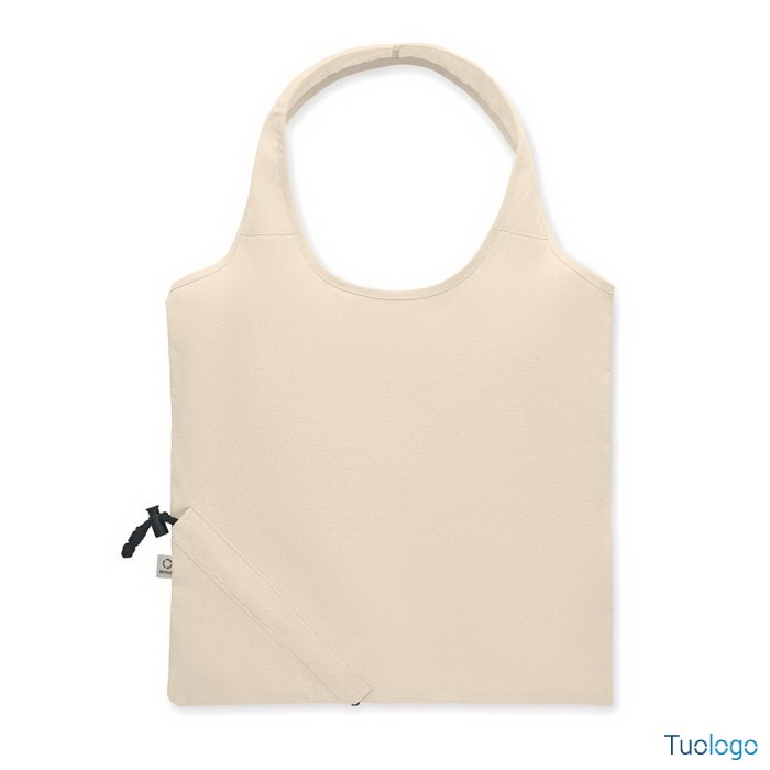 Shopper pieghevole in cotone riciclato Corrente. Shopper pieghevole in cotone riciclato pre-consumo (70% cotone riciclato e 30% RPET). 140 gr/m². Dimensioni: cm 38x40.