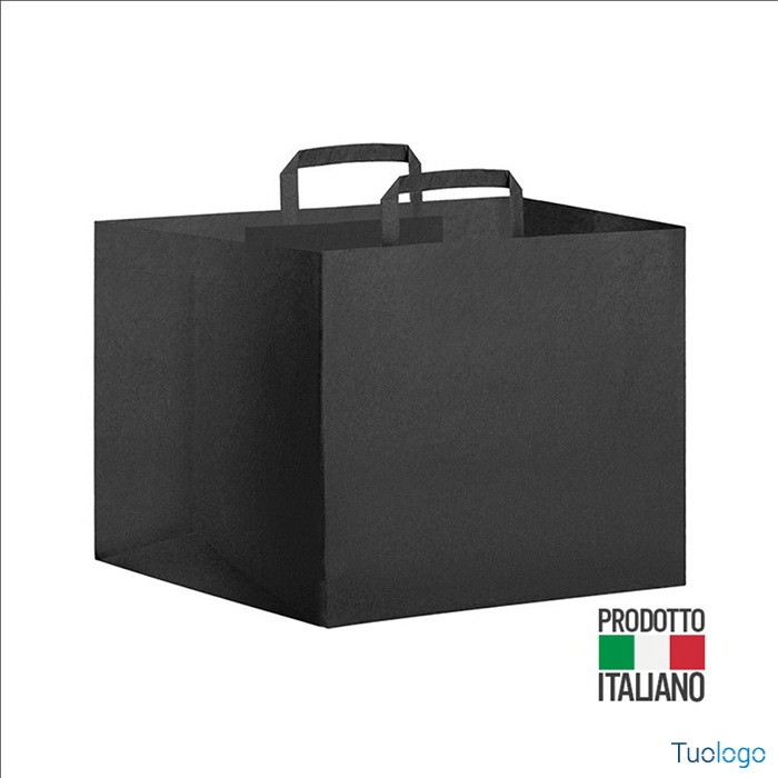 Shopper take away. In carta ririclata certificata 90 gr, portata 5 kg, manico piatto. Imballo 300 pezzi. Dimensioni: cm 32x22x33.