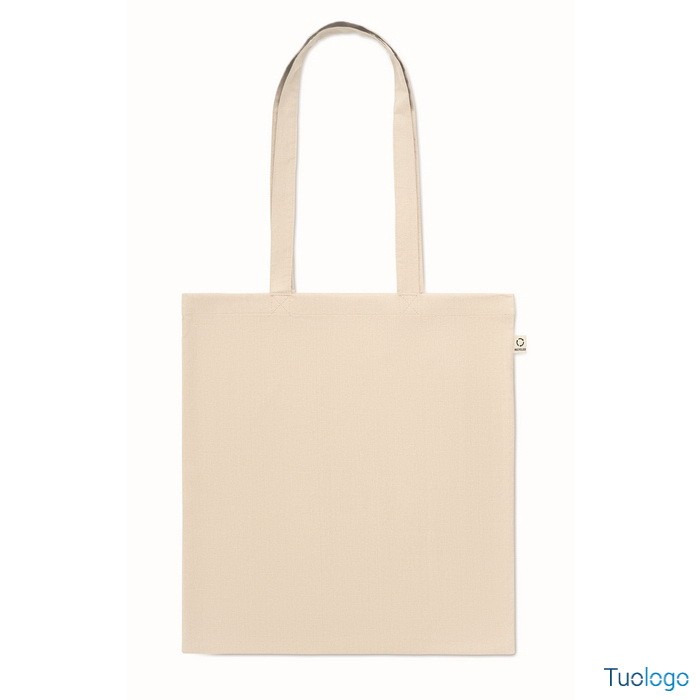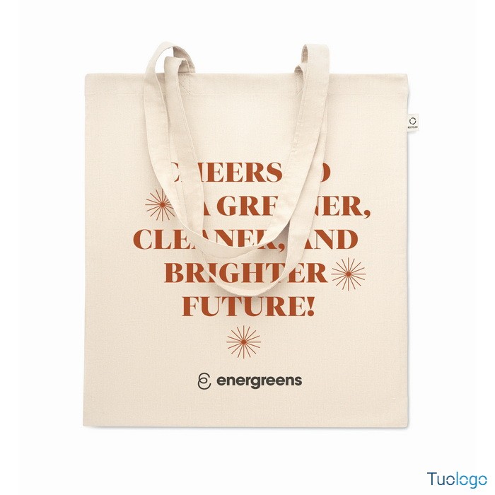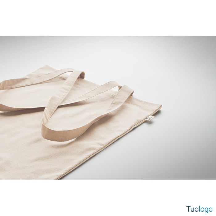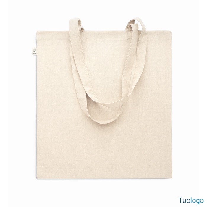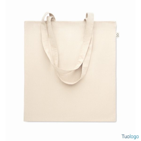 Shopper Viveva. Shopping bag in cotone riciclato post-consumo (70% cotone riciclato e 30% RPET) con manici lunghi. 140 gr. Dimensioni: cm 38x42.