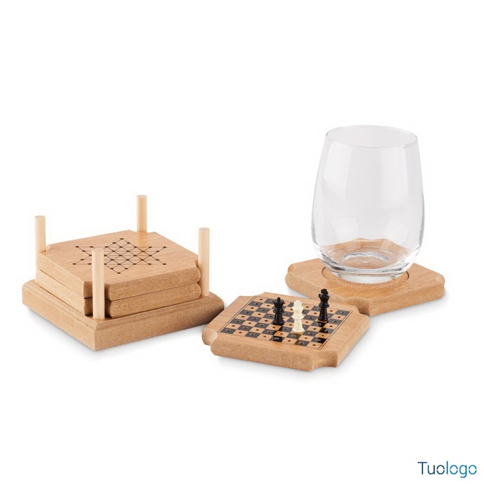 Sottobicchieri giochi Gandino. Set di 4 sottobicchieri in sughero e MDF con un set di 4 giochi: Tic-Tac-Toe, Backgammon, Scacchi e Dama cinese.Dimensioni: cm 10,6x10,6x7.
