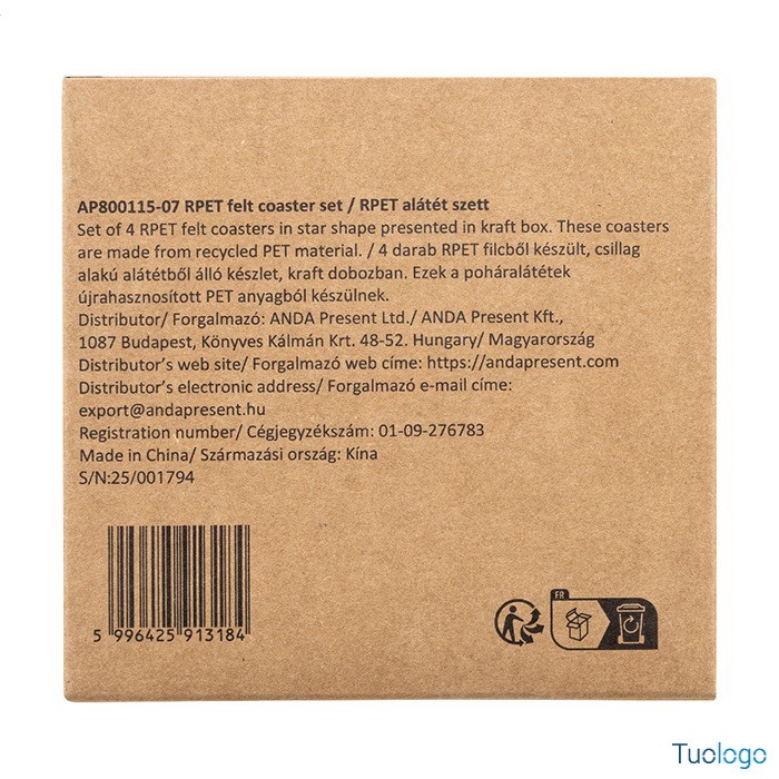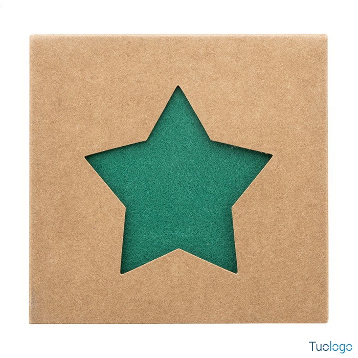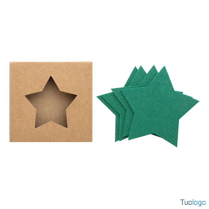 Sottobicchieri natalizi Laktec. Set di 4 sottobicchieri natalizi in feltro RPET a forma di stella confezionati in scatola di cartoncino kraft. Dimensioni: cm 11x11x2.