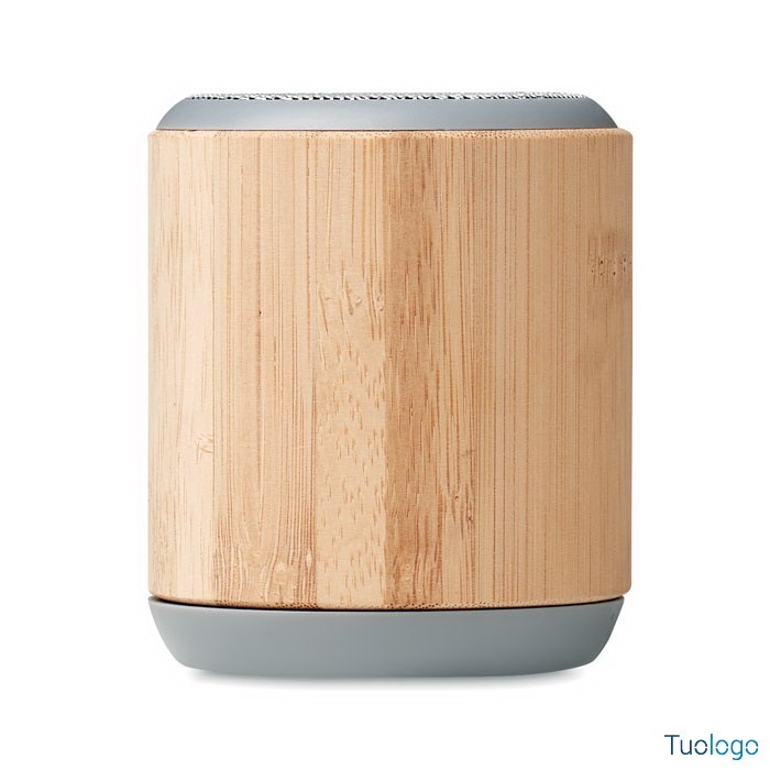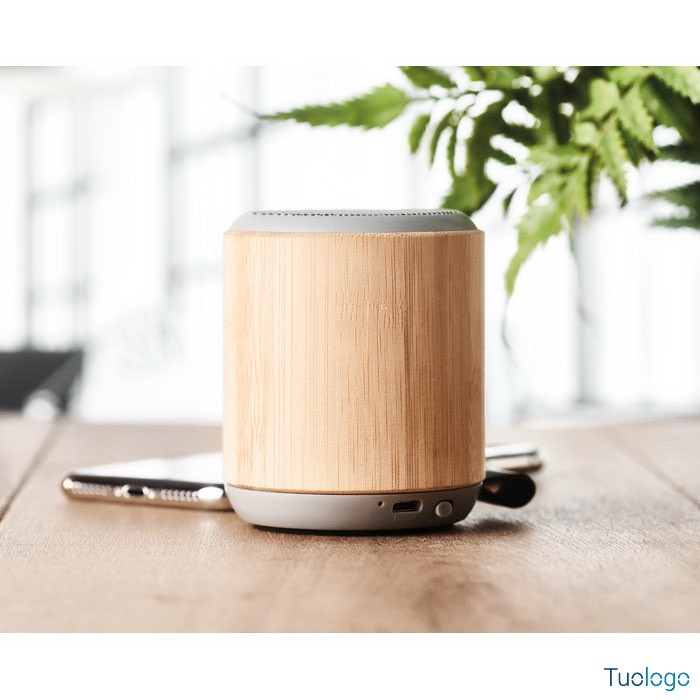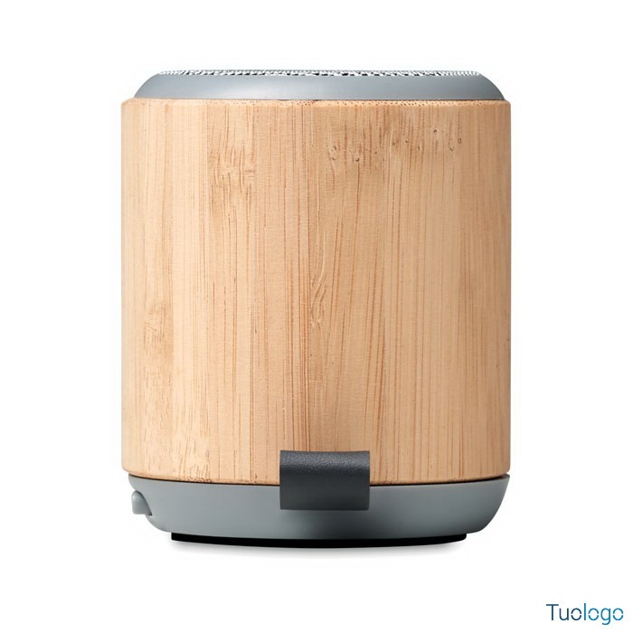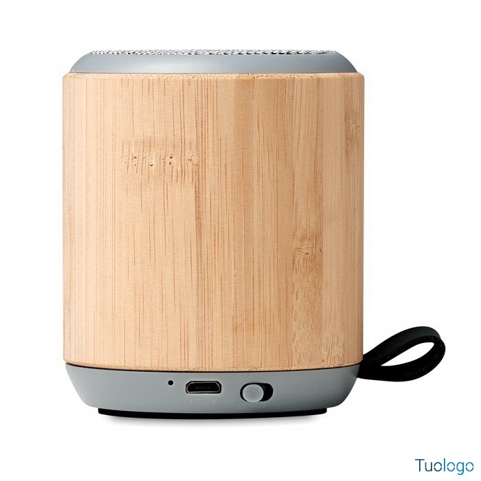 Speaker bluetooth 5.0 Carmiano. In bamboo e ABS con laccetto in PU. 1 batteria ricaricabile Li-Ion 300 mAh. Dimensioni: diam cm 6,8x8,1. Output: 3W e 4 Ohm. Tempo di autonomia di circa 2 ore.
